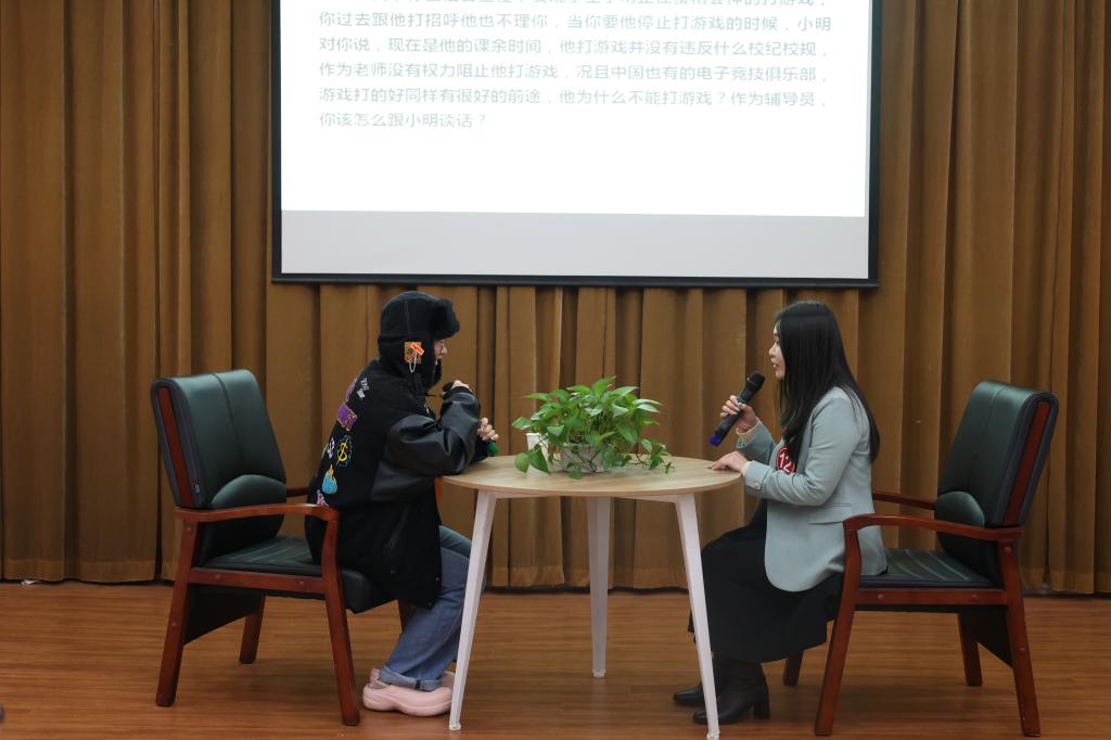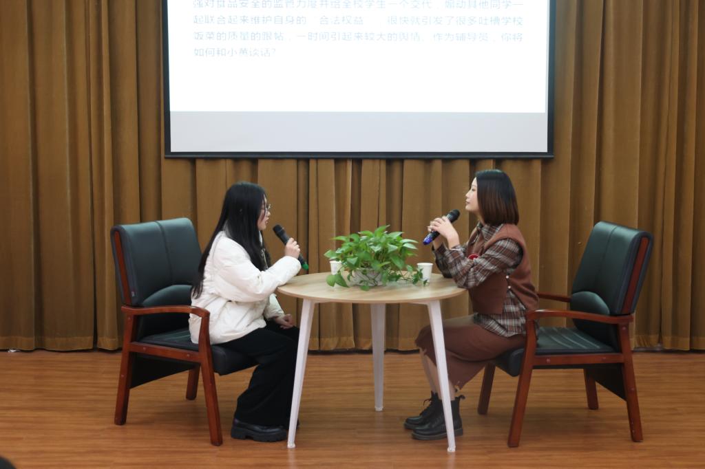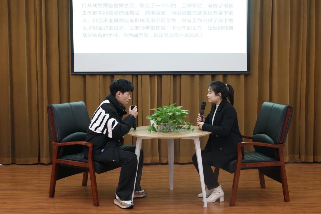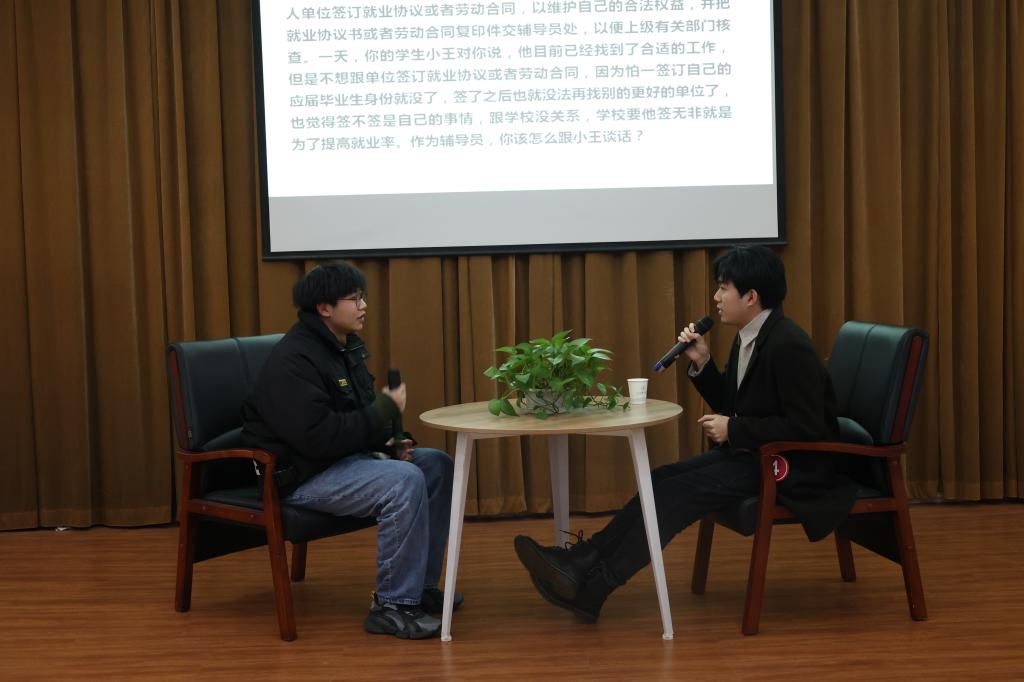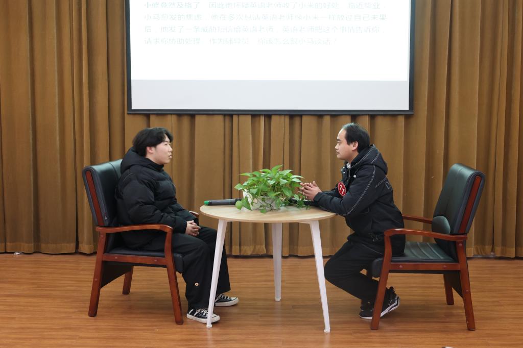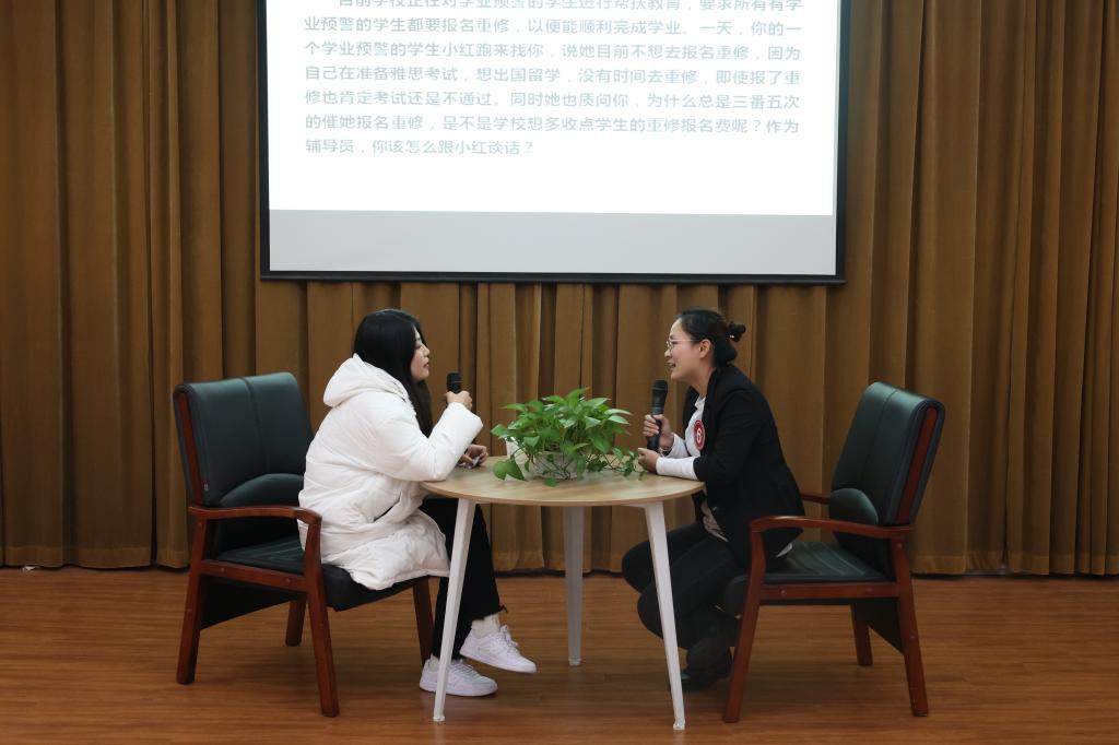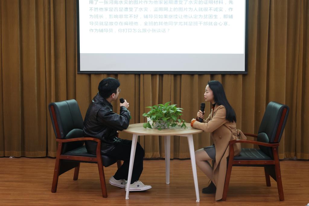 谈心谈话以现场情景再现的方式进行,主要考察辅导员对学生特征、学生成长成才规律的了解把握程度,对学生的教育引导能力、解决实际问题的能力等。参赛选手提前10分钟抽题,随后与学生进行现场谈心谈话。谈话结束后,选手需结合谈话情况进行简短总结,分析谈心谈话的解决思路及重、难点等。谈心谈话的内容涉及学生思想引领、日常管理、学风建设、资助育人、心理危机干预、就创业指导等多个方面。一个个棘手的问题,一件件重要的“小事”,一次次的迎刃而解,12名参赛辅导员围绕情景准确把握问题核心,谈话过程随机应变、有条不紊,充分展示了我校辅导员热情的工作状态、百变的工作技巧和扎实的工作能力,现场不时爆发出会心的笑声与掌声。