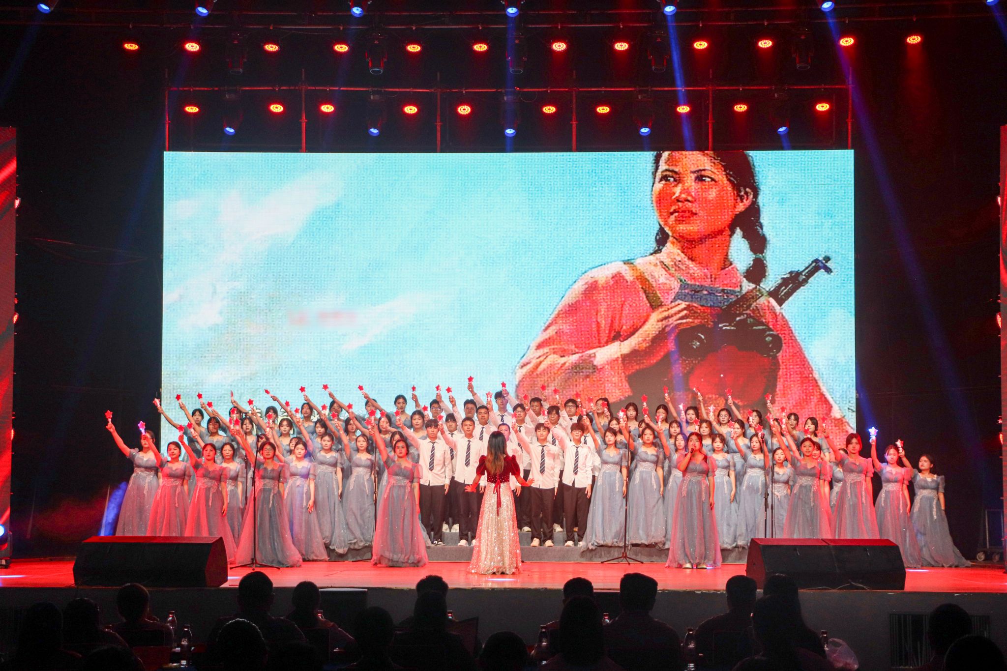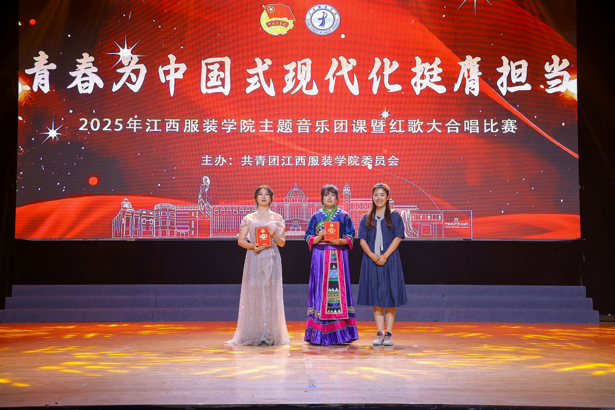 在第一阶段比赛中,各学院紧扣主题,精心演绎了《不忘初心》《映山红》《有我》《祖国不会忘记》等经典红歌。艺术设计学院以一首《不忘初心》拉开了序幕,深情回望党的百年征程;服装设计学院献上的原创歌曲《玉盘》,将传统文化与现代元素巧妙融合,赢得满场喝彩;人文学院带来的《映山红》,以动人旋律唤起观众对革命岁月的深刻记忆;商学院的《有我》则以铿锵有力的节奏唱响新时代青年的责任与担当;服装工程学院的《祖国不会忘记》,致敬无名英雄,感人至深;时尚传媒学院以《荆棘之上》展现媒体人不畏艰险、记录时代的使命;大数据学院则用《循着风去远航》唱出科技报国的青春誓言。
