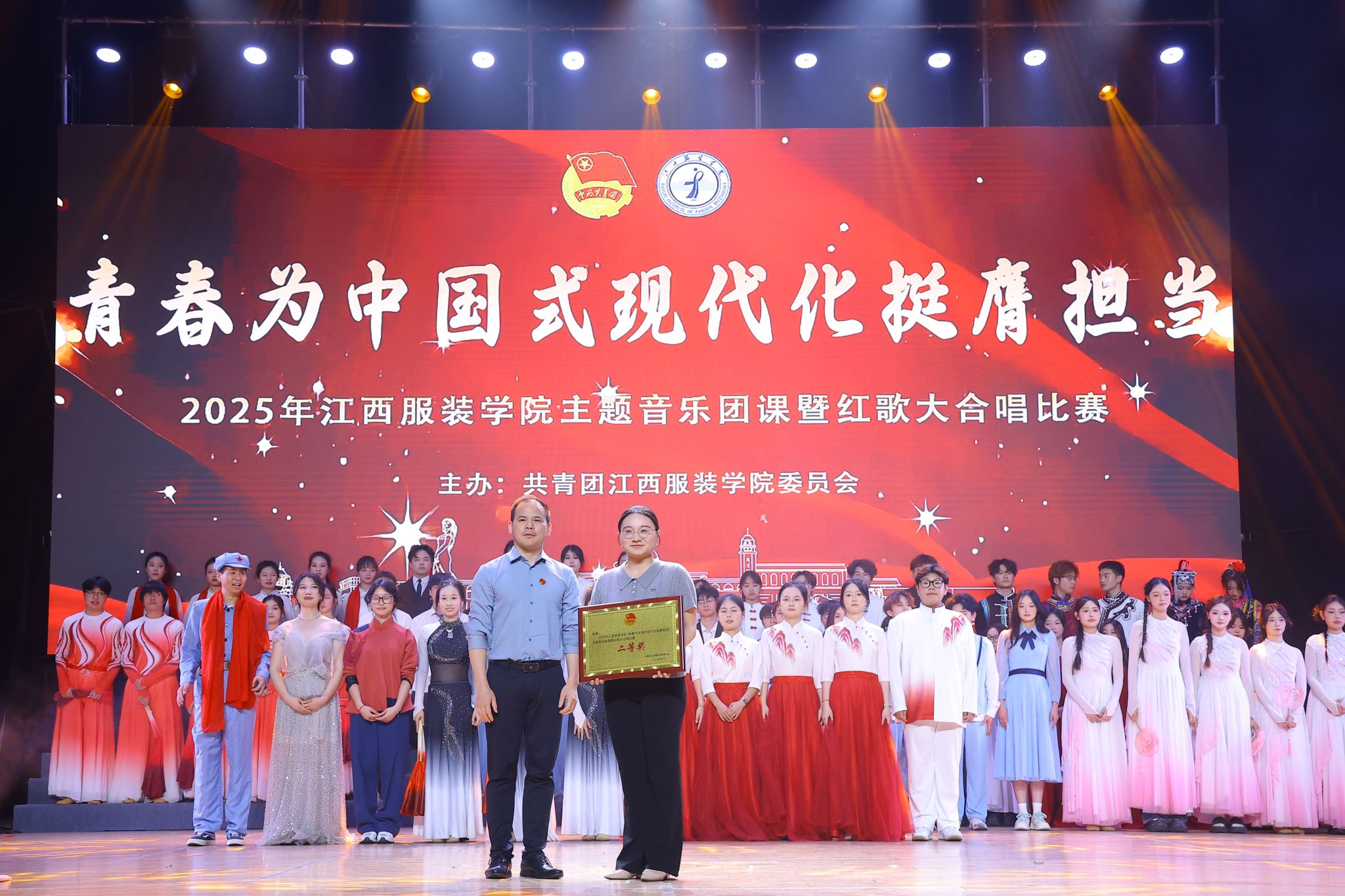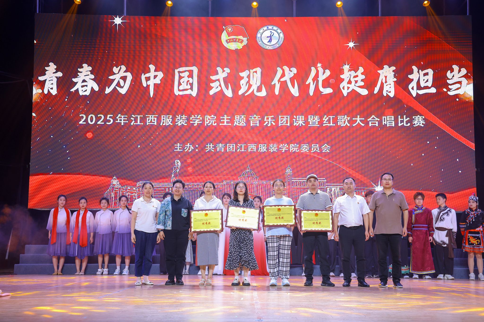 经过激烈角逐,最终服装设计学院荣获一等奖,服装工程学院荣获二等奖,时尚传媒学院荣获三等奖。大数据学院、人文学院、商学院、艺术设计学院等荣获优秀奖,服装设计学院刘品萱、服装工程学院郑晓晓荣获优秀指挥奖。颁奖环节气氛热烈,嘉宾们依次为获奖集体和个人颁发荣誉证书,并合影留念。