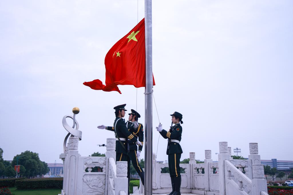 7时整,升旗仪式准时拉开帷幕。国旗护卫队步伐铿锵、队列严整,护送着五星红旗抵达国旗台。全体师生神情肃穆,齐声高唱国歌。在激昂雄壮的《义勇军进行曲》旋律中,五星红旗缓缓升起,迎风飘扬。