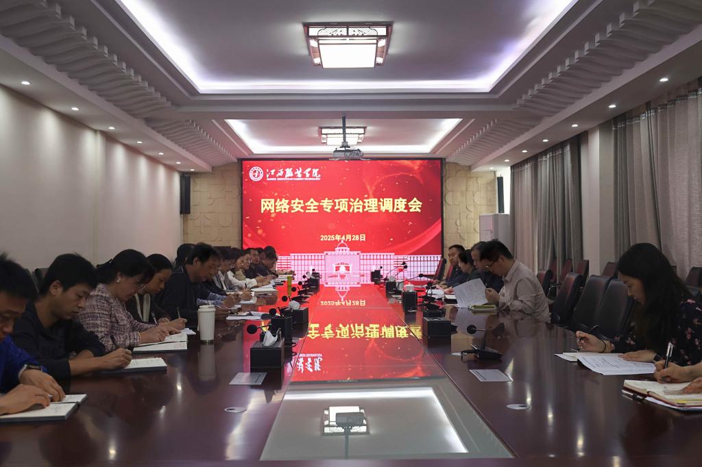 新闻中心讯(文/龙瑞行 图/樊翔)4月28日上午,江西服装学院召开网络安全专项治理调度会,深入贯彻总体国家安全观,切实维护学校安全稳定。校党委书记林井萍出席会议并讲话,党委副书记唐新强主持会议,相关职能部门负责人、各学院党委(党总支)书记、机关各支部书记参加会议。