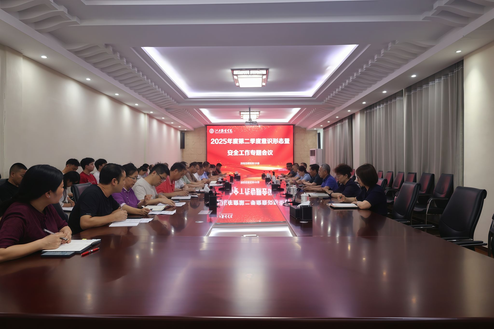 新闻中心讯(文/樊翔 图/万强)6月11日下午,我校在行政楼二楼会议室召开2025年度第二季度意识形态暨安全工作专题会议,传达学习上级相关文件和会议精神,研究部署当前和下一阶段学校意识形态和安全稳定工作的具体举措。党委书记林井萍、校长薛家宝及在家全体校领导出席会议,各学院(部)党政负责人、各部门主要负责人参加会议。