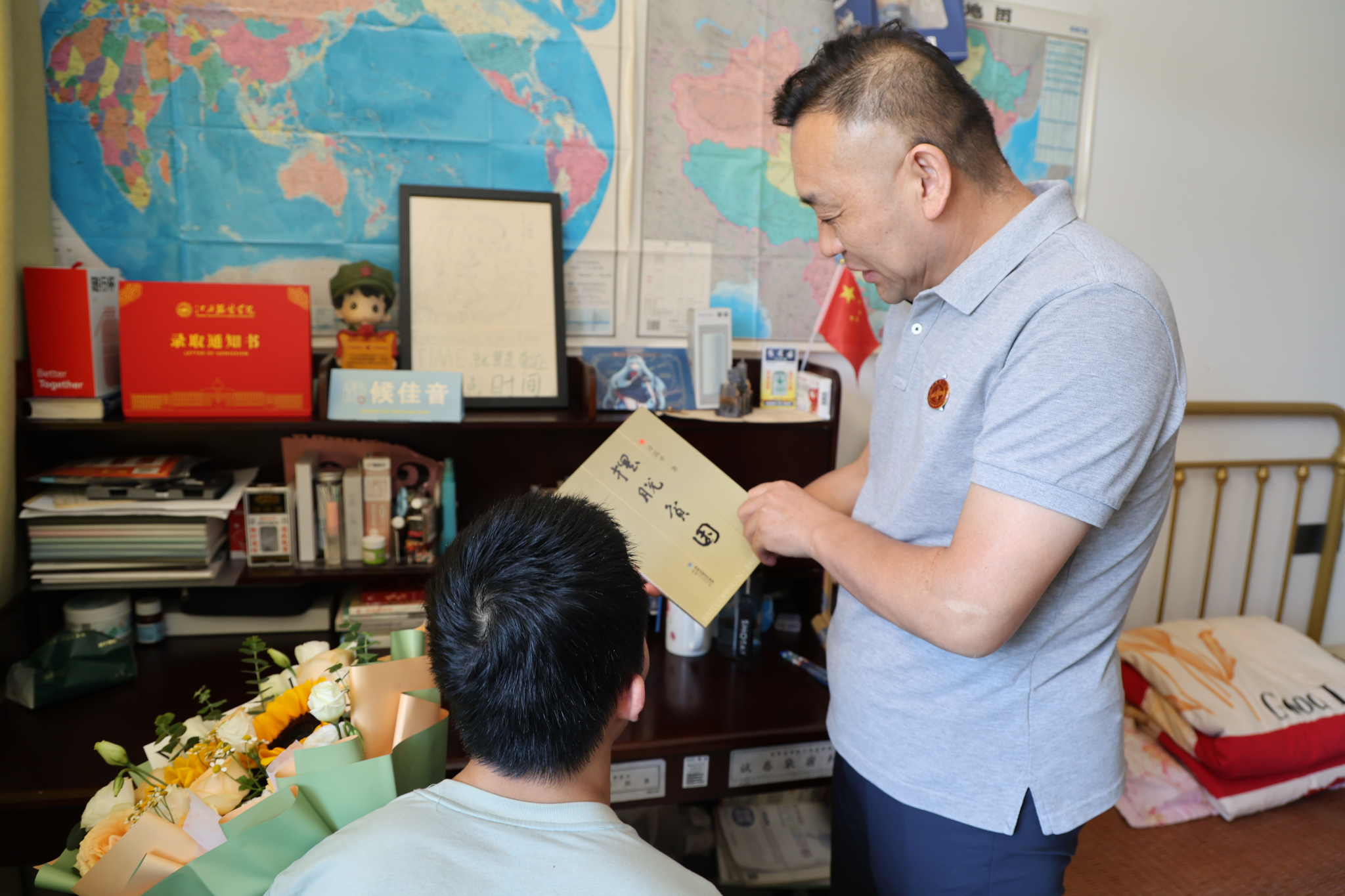 李宝君代表学校为童达内送上鲜花和精心准备的文创纪念品,与其亲切交谈,详细了解他的学习经历、康复情况和生活需求。得知童达内从小在病痛中坚持自学,高中阶段甚至多次推迟治疗时间用以学习,最终克服重重困难参加高考并成功被录取,李宝君深受感动,勉励他:“进入大学后要更加刻苦学习,开阔视野,做好学业与职业规划,掌握专业知识,锤炼过硬本领,让这四年成为人生最充实、最有价值的时光。”