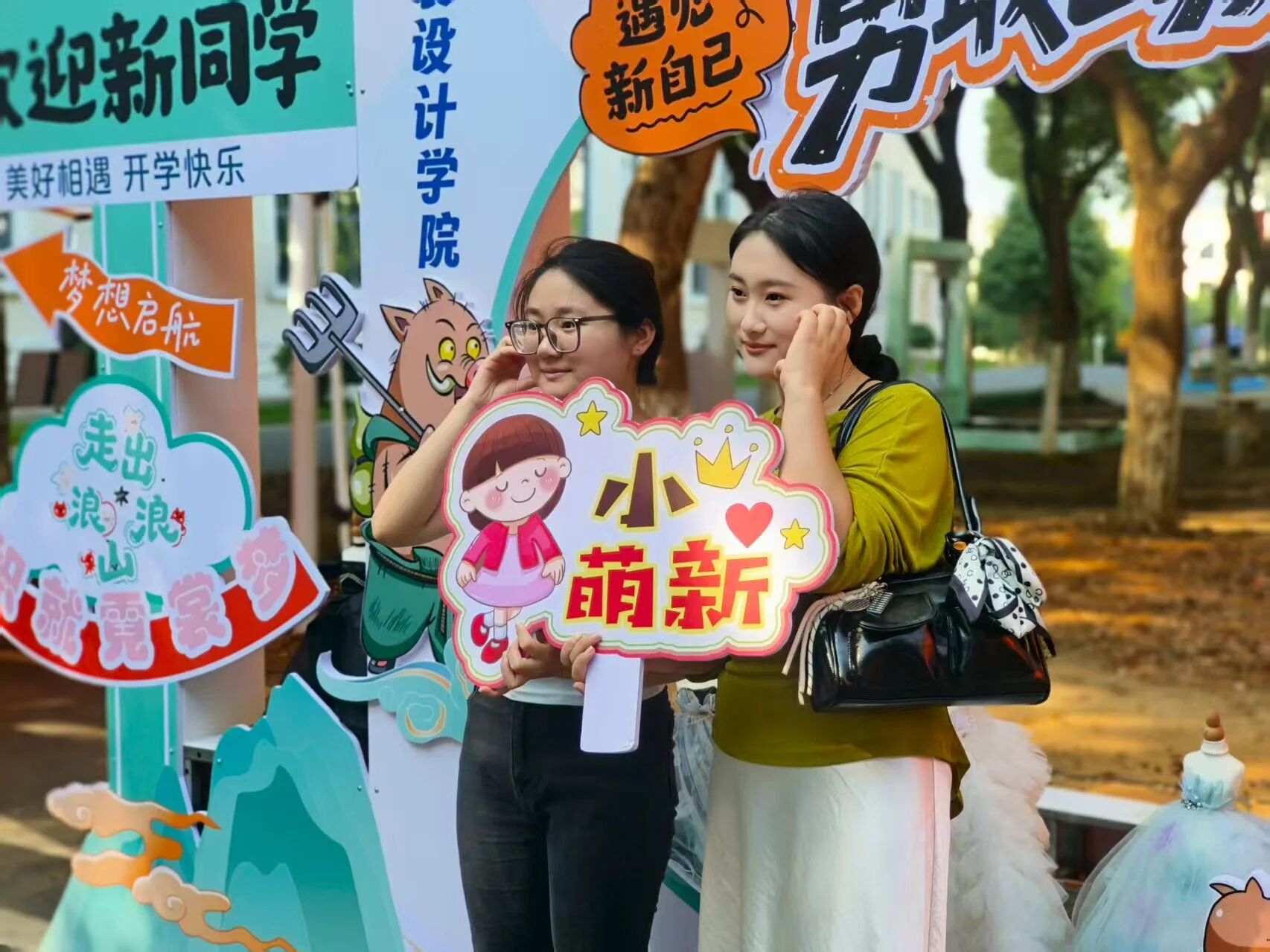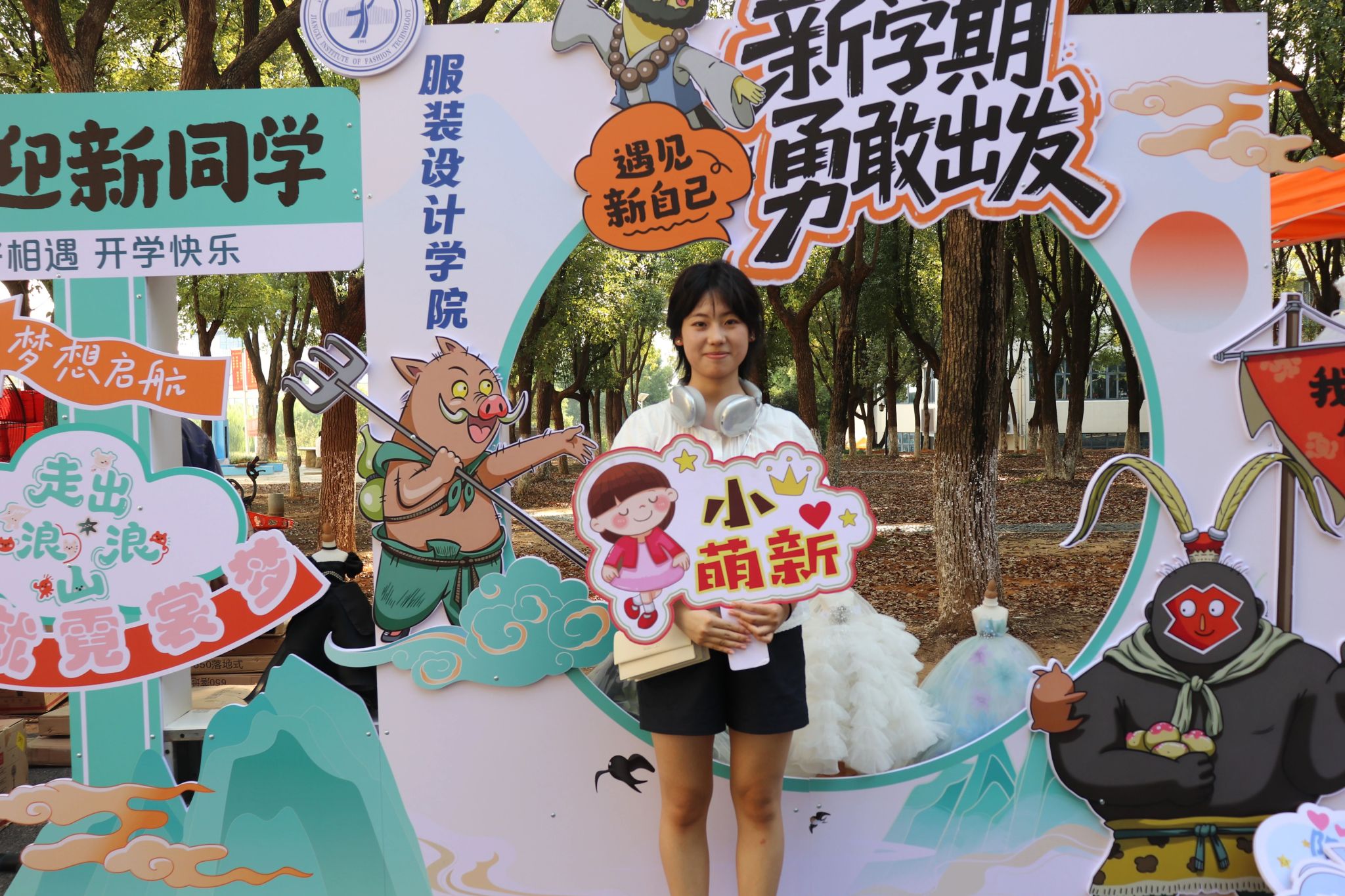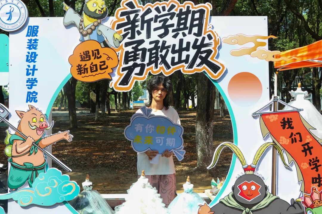 在江服专属拍照框前,萌新们扬起笑脸,定格“我与江西服装学院初相遇”的珍贵瞬间。