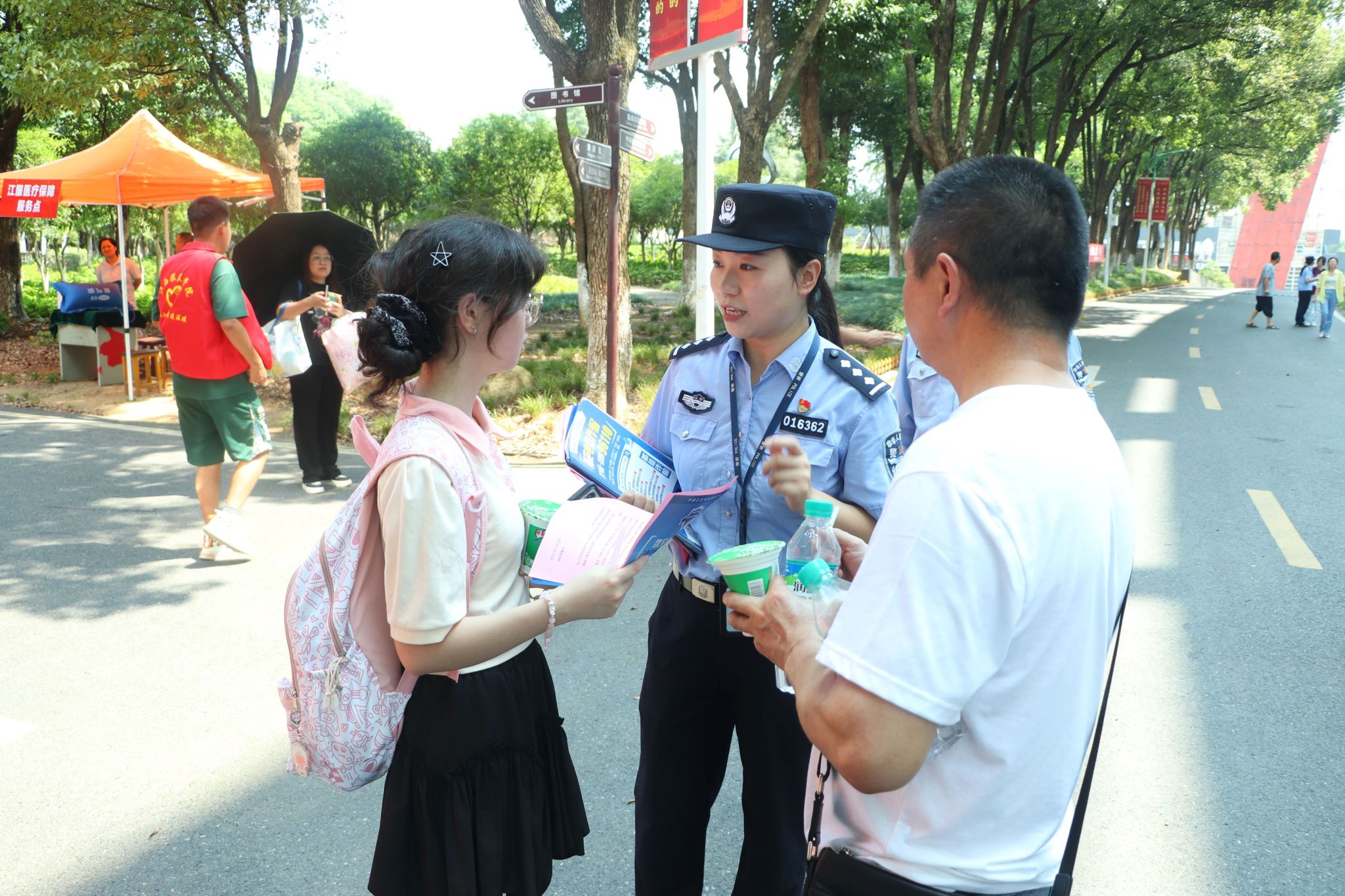 校园各处的安全防线由保卫处工作人员牢牢筑牢,他们值守在学校大门、霓裳宫广场、西区通道口等关键点位,一边维护现场秩序、疏导往来车流,为携行李的新生与家长清晰指引报到路线;一边耐心解答通行疑问,用细致服务为迎新流程 “保驾护航”。与此同时,驻地民警也深入校园,以 “警民同心、反诈同行” 为主题开展宣传教育,通过讲解典型案例、普及防范知识,为同学们即将开启的校园生活筑起一道坚实的 “反诈屏障”。