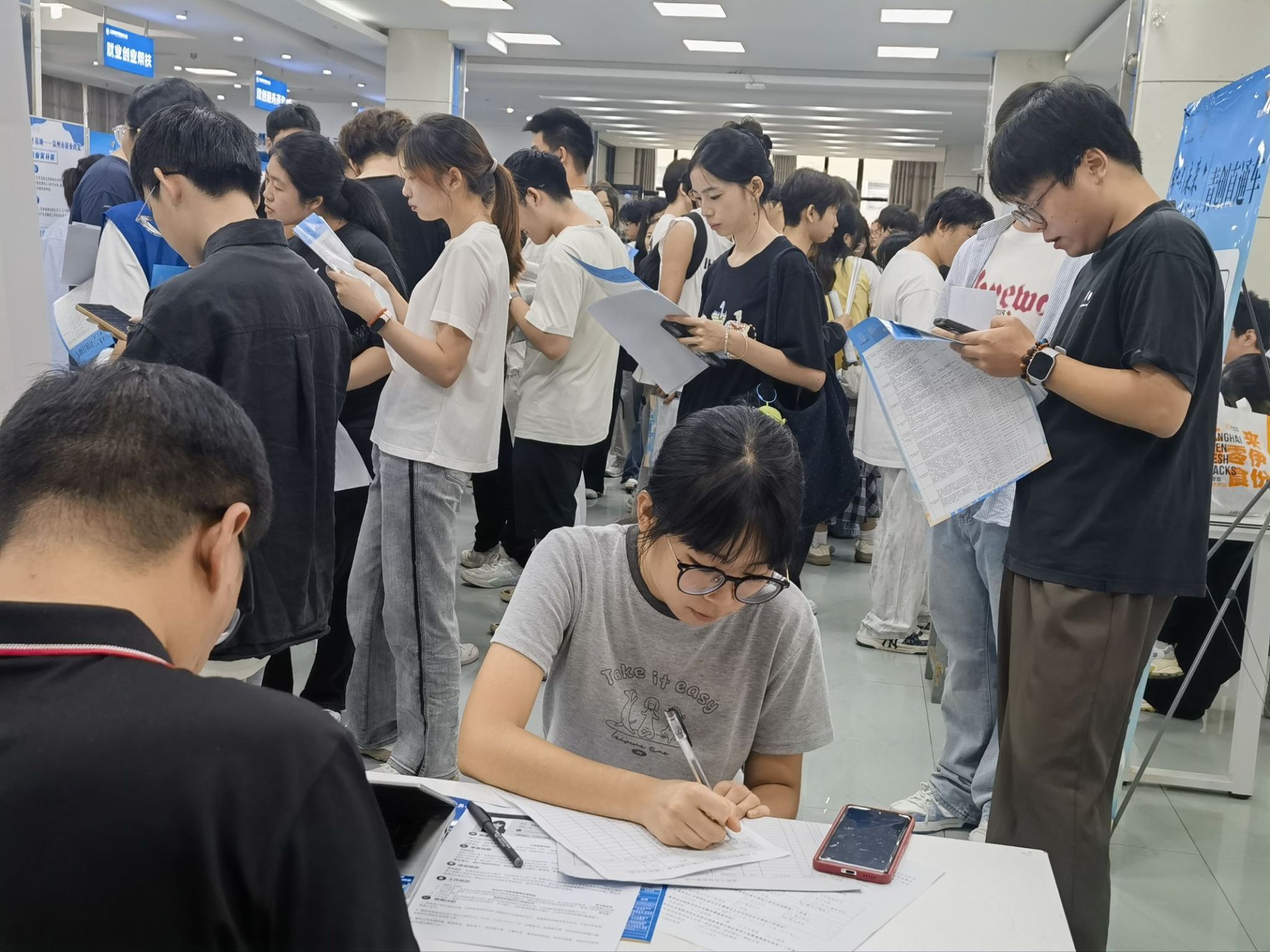 与此同时,“职引未来,筑梦吴兴” 湖州市吴兴区产业集群专场招聘会在江西服装学院思贤楼二楼大厅举行。16家优质企业携百余个岗位进校招才,岗位覆盖服装、文化传播、物流、制造业、教育等多个行业领域。招聘会现场人头攒动、气氛活跃,毕业生手持简历穿梭于各个展台,仔细阅读企业招聘信息,积极与招聘人员交流以展现个人优势;企业招聘人员耐心答疑解惑,详细介绍企业情况、岗位需求及薪资待遇,认真寻觅与岗位匹配的合适人才。此次招聘会为江西服装学院毕业生提供了丰富多样的就业选择,帮助毕业生更全面地了解招聘需求,也为他们积累了宝贵的求职经验和就业机遇。