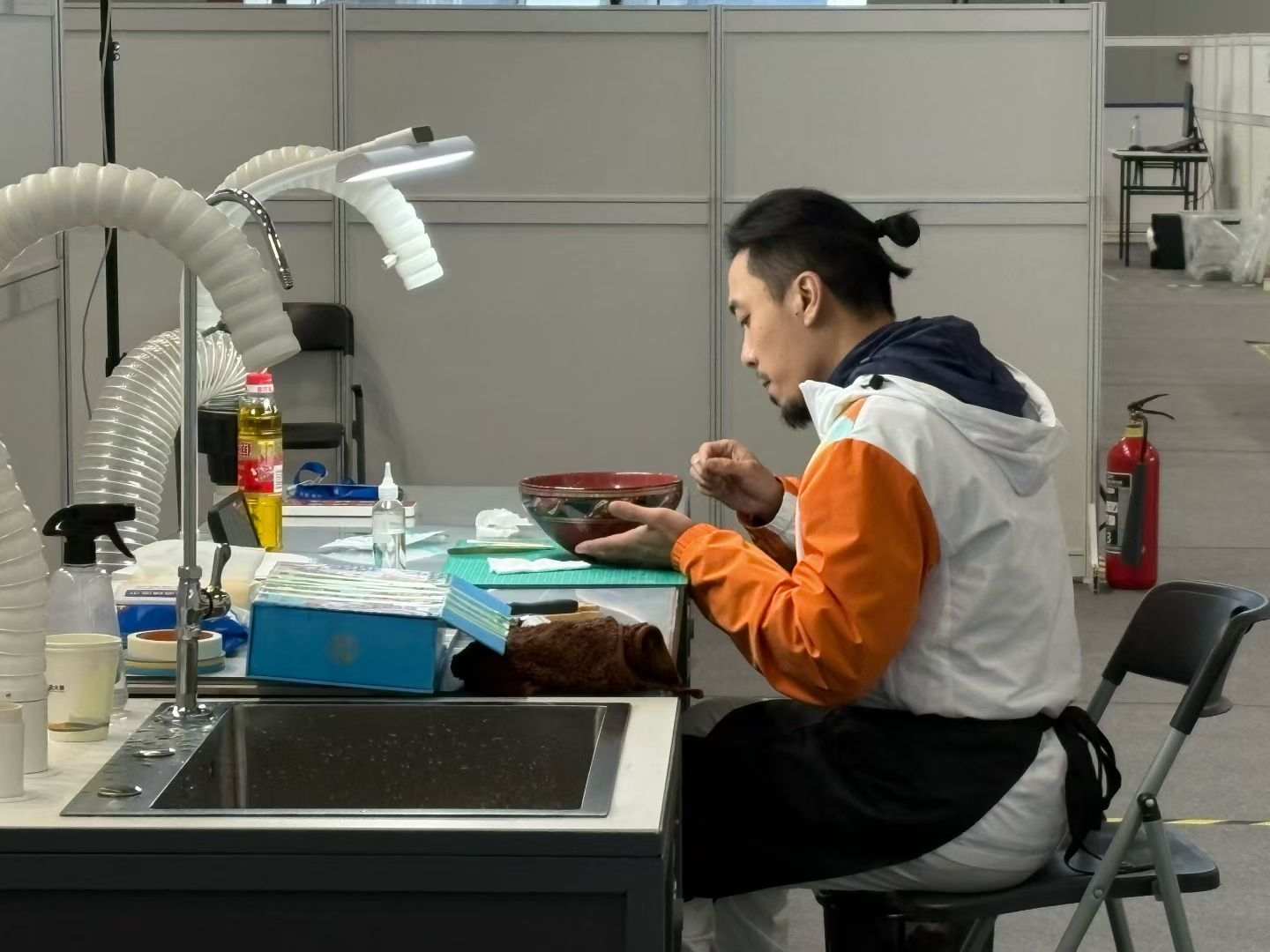 全国职业技能大赛是经国务院批准、人力资源社会保障部主办的综合性国家职业技能赛事,是我国赛事规格最高、竞赛项目最多、参赛规模最大、影响范围最广的综合性国家职业技能赛事。本届大赛汇聚了全国35个代表团的3420名各技能领域顶尖人才围绕106个竞赛项目同台竞技,竞争异常激烈。其中,漆艺制作作为传承中华优秀传统文化的重要项目,对选手的技艺熟练度、文化理解度及创新能力均有着极高要求。本次竞赛试题是以仰韶文化“白衣彩陶钵”为型制进行文创作品的创新设计和制作,重点比拼的是选手在传统漆器工艺与创新设计融合等方面的综合能力。备赛期间,吴先尧老师始终秉持精益求精的态度,深耕漆艺技法钻研,从漆料调配、胎体制作、纹样设计到髹涂打磨,每一个环节都反复打磨、不断精进,力求将传统漆艺与现代审美完美融合。吴先尧老师的这枚金牌,不仅是个人技艺水平的极致体现,也是江西服装学院长期以服务国家职业教育发展与地方产业升级为导向,高质量推进 “三院联动”人才培养模式改革、深化育人实践成果的又一有力佐证。