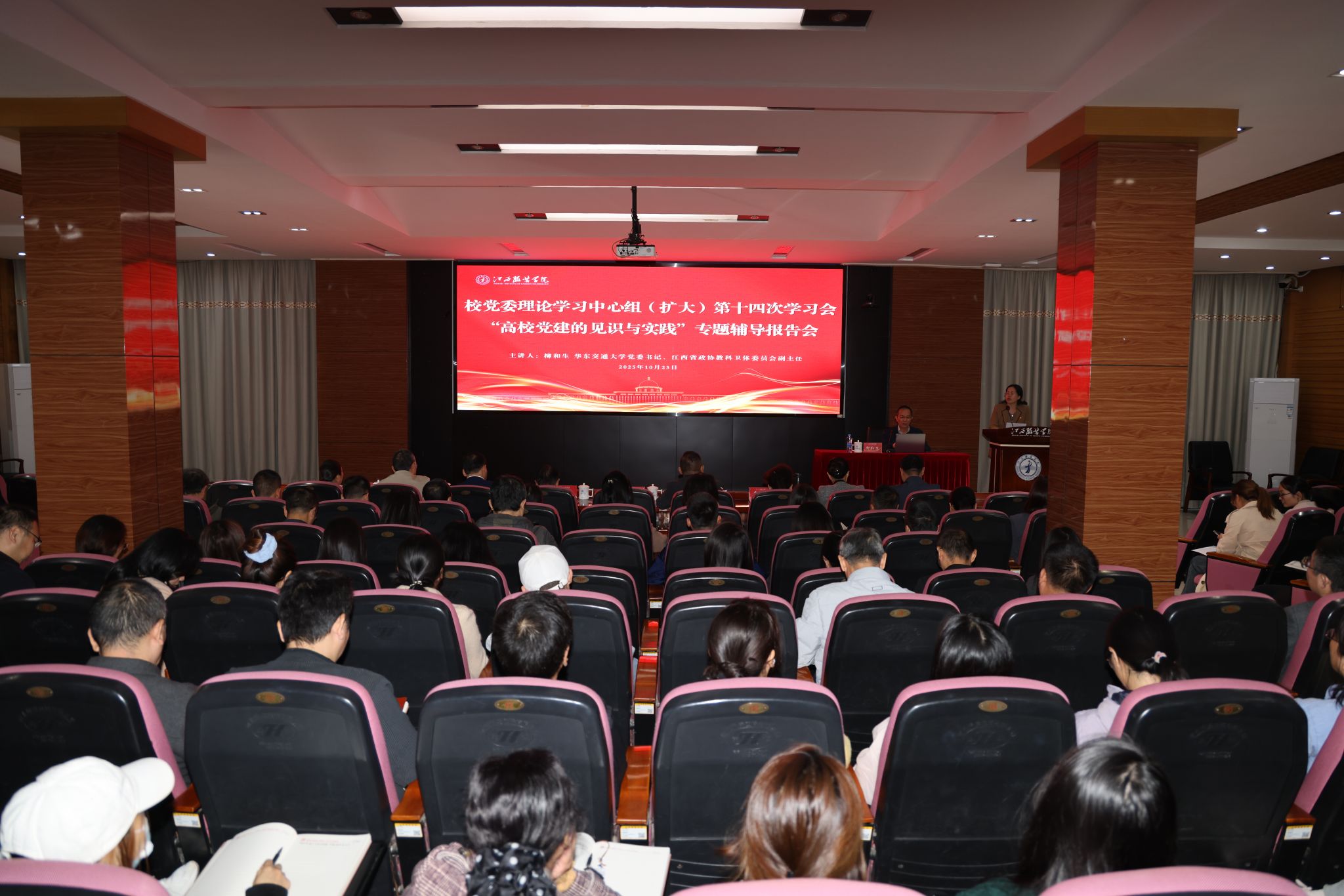 新闻中心讯(文/龙瑞行 图/万强)10月23日上午,我校在行政楼一楼报告厅召开党委理论学习中心组(扩大)第十四次学习会。会议特邀华东交通大学党委书记、江西省政协教科卫体委员会副主任柳和生作专题辅导报告。学习会由校党委书记林井萍主持。全体在家校领导、中层干部,专兼职党务工作者及辅导员参加了此次学习。