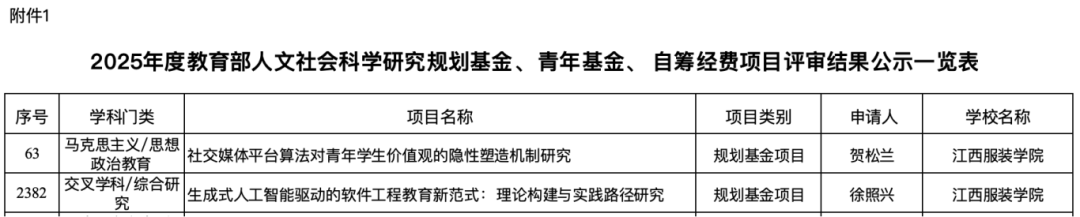 新闻中心讯(供稿/科研处)近日,教育部社科司公示了2025年度教育部人文社会科学研究一般项目评审结果,我校大数据学院徐照兴教授主持的《生成式人工智能驱动的软件工程教育新范式:理论构建与实践路径研究》以及马克思主义学院贺松兰教授主持的《社交媒体平台算法对青年学生价值观的隐性塑造机制研究》,双双入选规划基金项目公示立项名单。此次立项是我校连续第四年获批教育部人文社会科学研究项目,连续两年同时斩获2项项目立项,是此次江西省内唯一获批立项的民办高校。