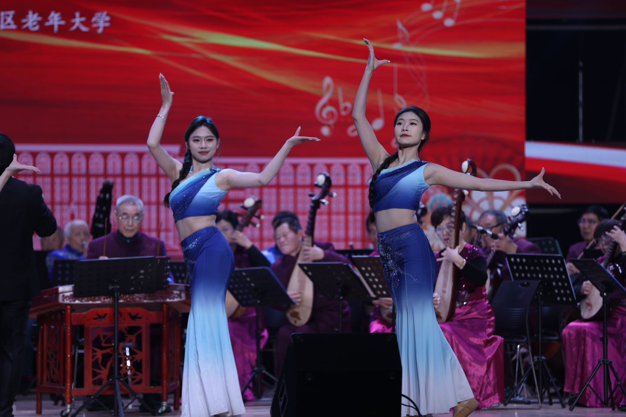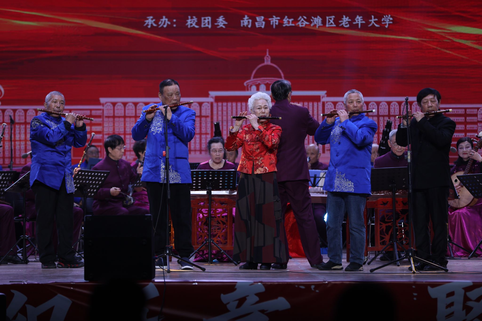 第一篇章“乐忆初心岁启新程”以悠扬民乐拉开帷幕。红谷滩区老年大学民乐团带来的民乐合奏《新春乐》节奏明快、暖意融融,瞬间点燃现场氛围;《乡行》乐声轻柔婉转,如清风拂过田野,勾勒出静谧悠远的乡间画卷;女子表演唱《梦回故郡》女声清婉灵动,一吟一唱间诉说深厚家国情怀;《边南风情》中,同学们身着傣族服饰翩翩起舞,与老艺术家的民乐演奏相得益彰,尽显浓郁民族风情;竹笛合奏《扬鞭催马运粮忙》笛声激越昂扬,将丰收的喜悦诠释得淋漓尽致;歌舞《洗衣歌》生动演绎出军民互助、藏汉同心的动人图景;民乐合奏《抗日战歌连奏》乐音铿锵有力,重温烽火岁月,激荡起深沉的民族精神。