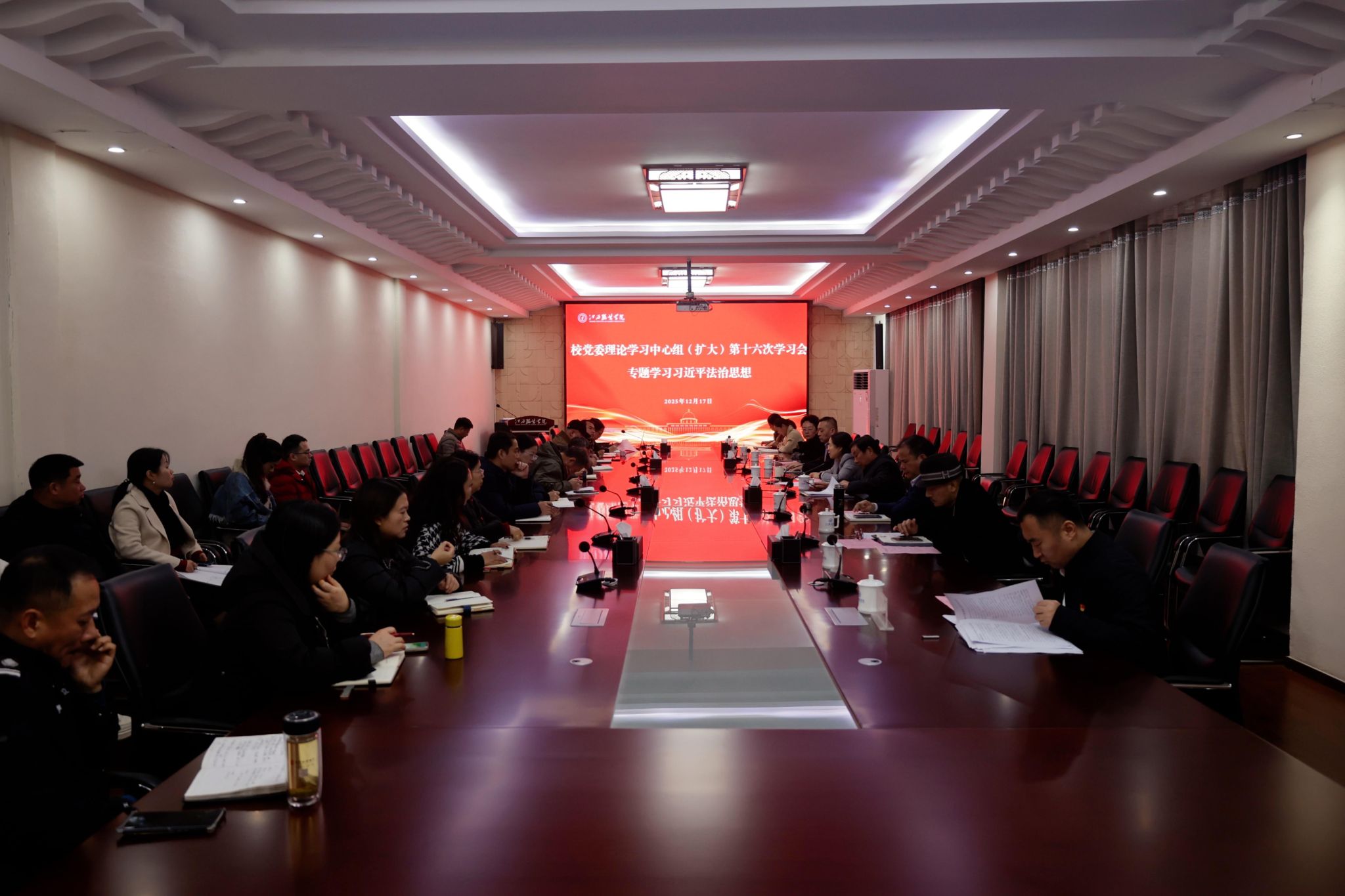 新闻中心讯(文/龙瑞行 图/万强)12月17日,我校召开党委理论学习中心组(扩大)第十六次学习会,专题学习习近平法治思想,深入学习《习近平法治思想学习纲要》,研究贯彻落实意见。校党委书记林井萍主持会议并讲话。
