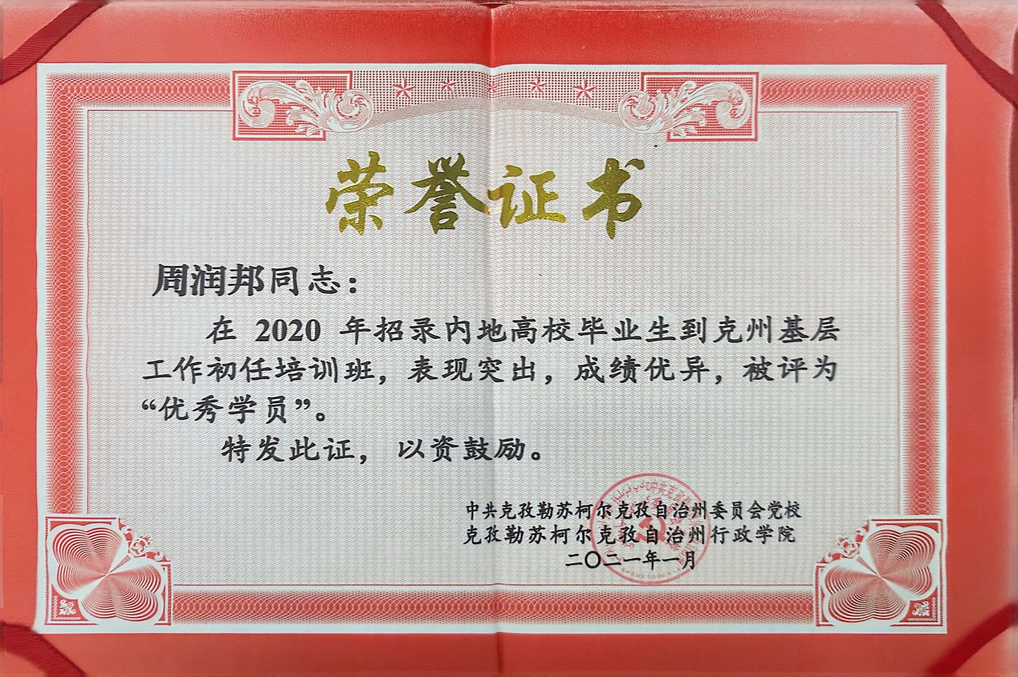 周润邦校友2016年进入我校艺术设计学院学习,在校期间品学兼优,曾担任校团委学生副书记,并获得“江西省优秀共青团员”等多项荣誉,是师生眼中的优秀学生骨干。2020年毕业时,他主动放弃城市的发展机会,积极响应国家号召,怀揣“到祖国最需要的地方去”的理想信念,毅然奔赴新疆克州,扎根基层一线。