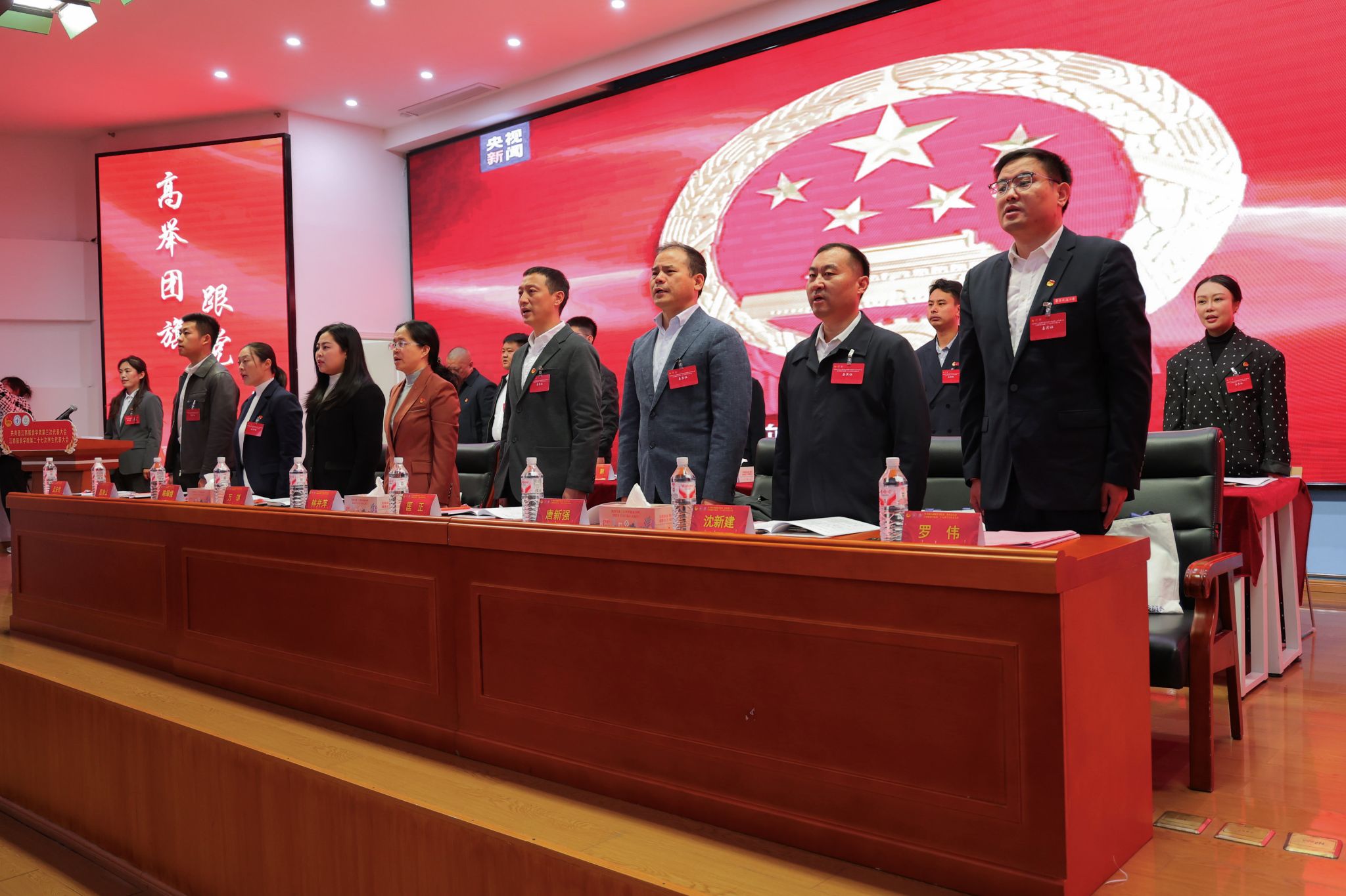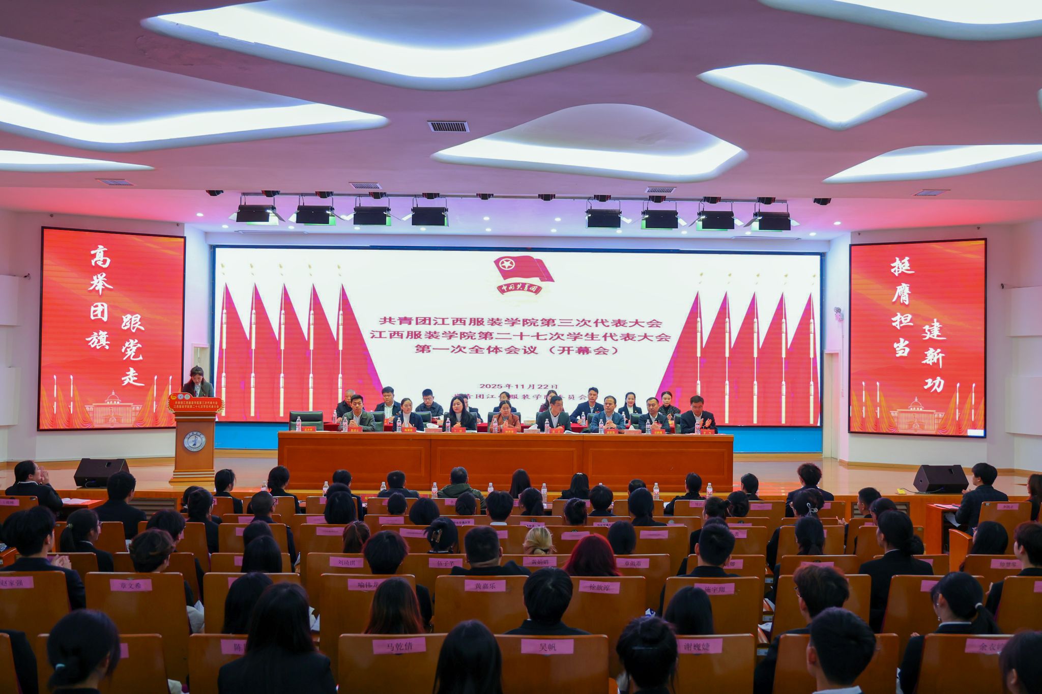 大会在雄壮的国歌声中正式开幕。全体与会人员肃立致敬,激昂的旋律在会场回荡,凝聚起江服青年听党话、跟党走的坚定信念,也为这场青春盛会奠定了庄严奋进的基调。