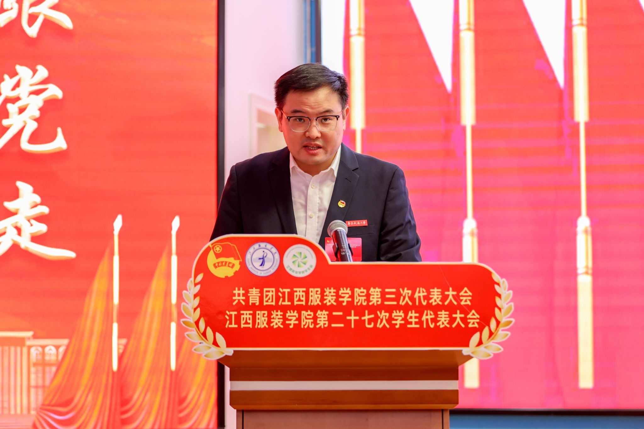 团南昌市委副书记万琪在讲话中向大会的召开致以热烈祝贺,她充分肯定了江西服装学院共青团在思想引领、实践育人、志愿服务和品牌打造等方面取得的亮眼成绩,充分展现了江服青年信念坚定、专业扎实、勇于担当的精神风貌。面向未来,她寄语江服青年:一要以信念为笔,绘就青春底色,要锤炼本领,让青春在与时代同向、与祖国同行中,绽放出鲜明的红色底色;二要以专业为墨,书写成才华章,在服务产业升级与文化传承中展现专业担当,努力成为既能坚守传统根脉、又能引领时尚潮流的专业人才;三要以实践为纸,担当时代使命,让青春在服务南昌发展、助力中国式现代化建设的生动实践中绽放光彩。她表示团市委将一如既往支持学校共青团工作,并希望新一届团委团结带领广大青年为谱写中国式现代化江西篇章贡献青春力量,并预祝大会圆满成功。
