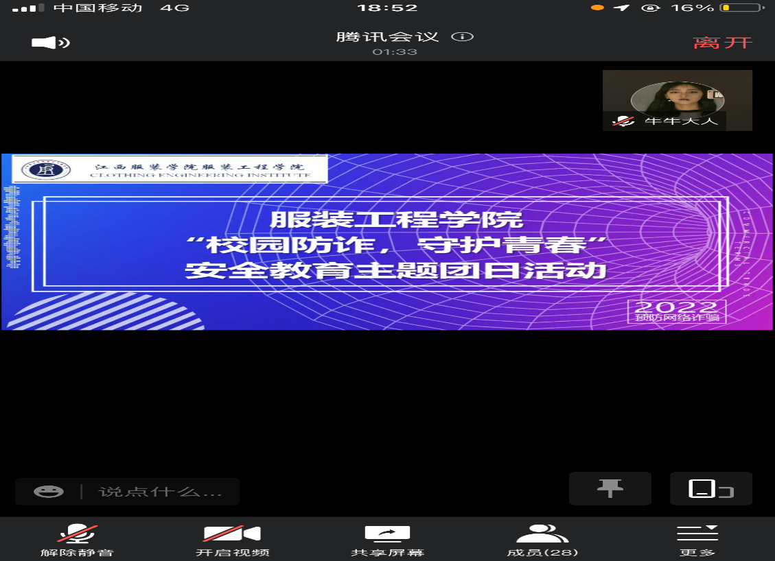 服装工程学院讯(撰稿:万芦蓉)许多不法分子经常利用新型手段对学生实施诈骗,校园被骗案例屡屡发生,为进一步加大反诈宣传教育的力度,提高大学生反诈骗意识和能力,维护广大师生切身利益,共同形成全民反诈的良好氛围, 4月19日晚7:00时,服装工程学院利用腾讯会议开展了线上“校园防诈,守护青春”主题团日活动。