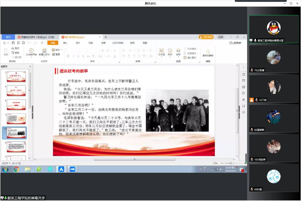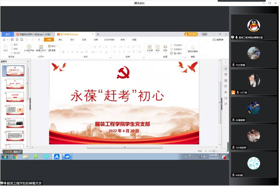 服装工程学院讯(撰稿:黄小芳)历史如潮,大道如砥。为了深入学习贯彻习近平新时代中国特色社会主义思想,走好新时代“赶考之路”,4月20日晚7:00时,服装工程学院学生党支部通过腾讯会议组织开展了“永葆‘进京赶考’初心”主题党日活动。学生党支部非毕业班党员、预备党员和部分入党积极分子参加了活动,活动由党总支书记彭波主持。