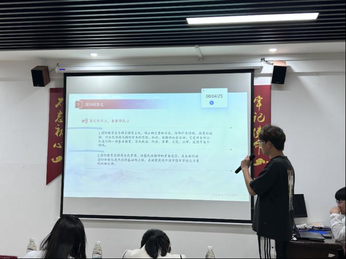 本次比赛通过赛前抽签方式决定出场顺序,在主持人结束介绍后,比赛正式开始。参赛选手以“爱我国防”为主题,结合自身经历,阐述自己的观点。国防教育是提高全民素质、培塑民族精神的重要途径,是全面推进国防和军队现代化的基础性工程,是凝聚实现中国梦强军梦强大力量的战略之举、长远之策。