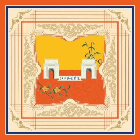 元素解析:作品中校门的元素取景于学校的二号校门,校门是江服学子们大学生涯的开始,也是校园中的一处地标建筑,校门不仅寓意着江服学子大学生活的开始,而且表达了江服的校门永远为校友们敞开,随时欢迎校友回家。主教学楼是江服学子们学习的场所,是知识的摇篮,也是校园中的标志性建筑,故将教学楼置于画面的视觉中心。作品中的花纹还参考了霓裳宫的图案和柳絮。霓裳宫是学校各类赛事的常用举办地,借此以体现江西服装学院特色办学理念,以服装教育为特色,构建艺、工、管、经、文多学科协调发展的学科专业体系。柳絮飘扬,绿意盎然,运用校园中柳絮的元素体现了江西服装学院轻松愉悦的学习氛围。作品中心的形状则取自缀荷池的荷花形状,寓意江西服装学院30年出淤不染、亭亭玉立。一心一意办教育。无畏风雨,砥砺前行。而桂花象征着收获,也寓意着江服学子在江西服装学院学习知识,收获更好的自己,桂花飘香,学有所成。作品还运用了图形进行辅助,以优美的线条组成复合图形勾勒出教学楼的形状,起到丰富画面的作用。