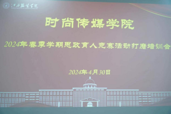 时尚传媒学院讯随着2024年春季学期的到来,时尚传媒学院积极响应国家教育改革号召,以培养德智体美劳全面发展的高素质人才为目标,于2024年4月30日在艺术楼430隆重举办了2024年春季学期思政育人竞赛活动打磨培训。康艳红老师,耿渤添老师,杨丹老师和胡艺伟老师参与了此次活动。此次活动旨在通过专业指导和实战演练,全面提升学生的思想政治素质和社会实践能力,为即将拉开帷幕的思政育人竞赛活动奠定坚实基础。