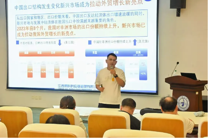 15日,外研社特邀江西易科供应链管理有限公司总经理、江西省三赭化妆用品有限公司执行总监刘佳琦为同学们开展讲座。刘总回顾我国外贸行业的变迁与发展历程,介绍跨境贸易的常见渠道和基本业务流程,分析行业核心岗位的工作内容和能力要求,为大学生成为高素质行业人才提供建议。