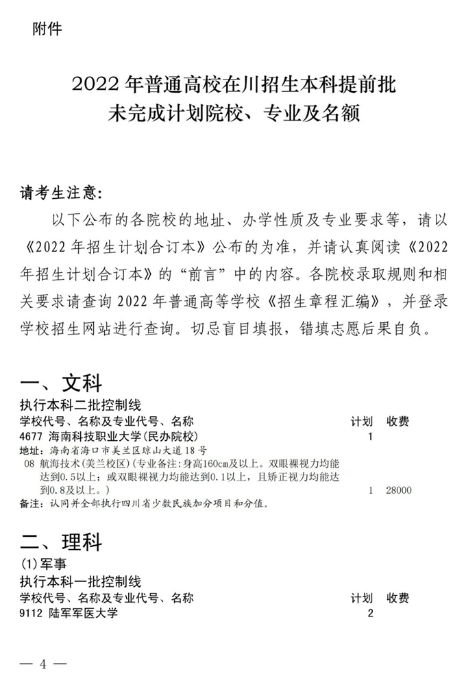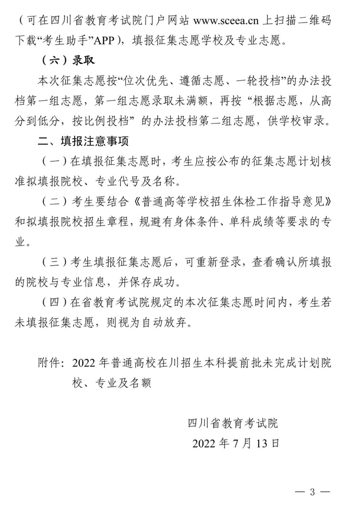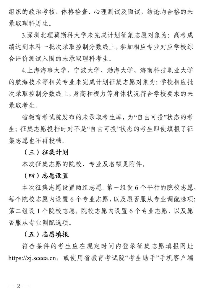 四川:关于本科提前批未完成计划院校征集志愿的通知