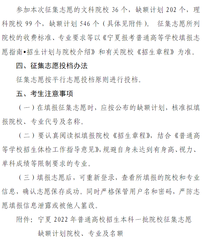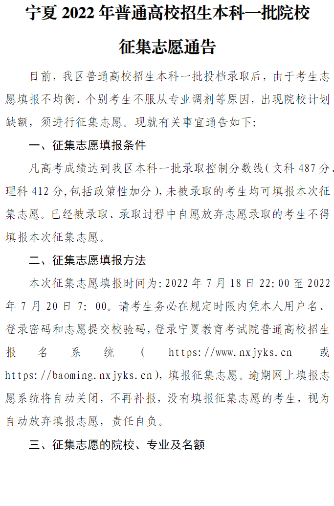 宁夏:2022年普通高校招生本科一批院校征集志愿通告