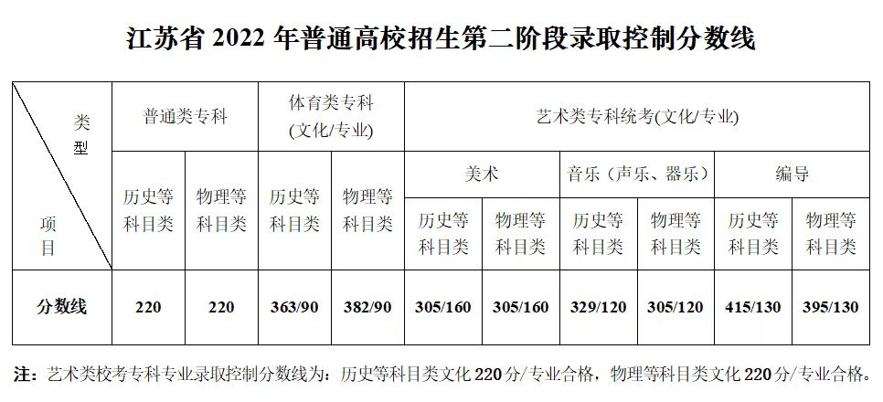 江苏:2022年普通高校招生第二阶段录取控制分数线