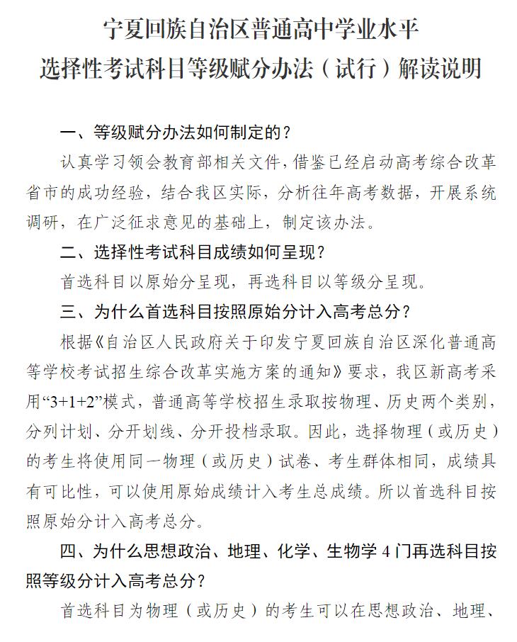 宁夏回族自治区普通高中学业水平选择性考试科目等级赋分办法(试行)解读说明