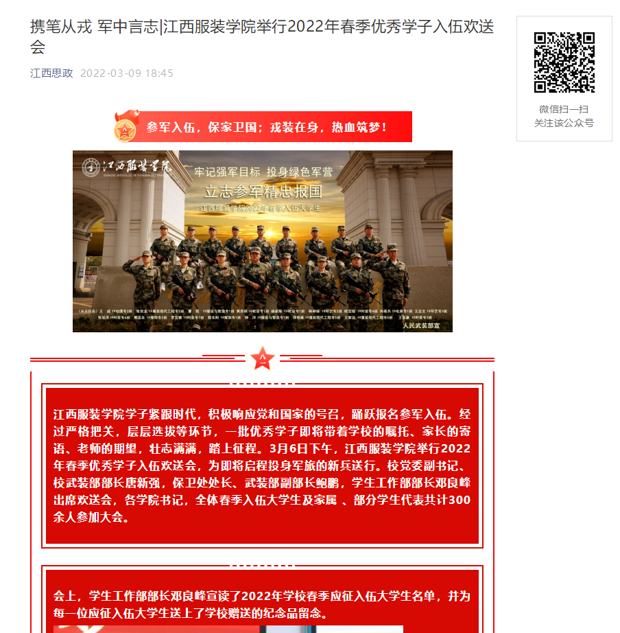 江西服装学院学子紧跟时代,积极响应党和国家的号召,踊跃报名参军入伍。经过严格把关,层层选拔等环节,一批优秀学子即将带着学校的嘱托、家长的寄语、老师的期望,壮志满满,踏上征程。3月6日下午,江西服装学院举行2022年春季优秀学子入伍欢送会,为即将启程投身军旅的新兵送行。校党委副书记、校武装部部长唐新强,保卫处处长、武装部副部长鲍鹏,学生工作部部长邓良峰出席欢送会,各学院书记,全体春季入伍大学生及家属 、部分学生代表共计300余人参加大会。