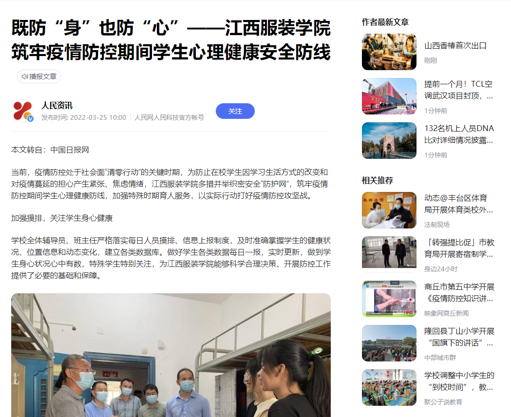 人民资讯:既防“身”也防“心”——江西服装学院筑牢疫情防控期间学生心理健康安全防线