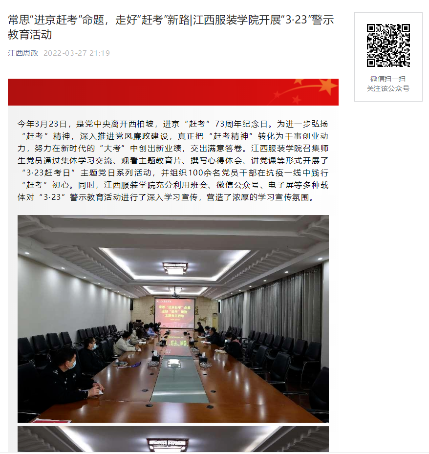 今年3月23日,是党中央离开西柏坡,进京“赶考”73周年纪念日。为进一步弘扬“赶考”精神,深入推进党风廉政建设,真正把“赶考精神”转化为干事创业动力,努力在新时代的“大考”中创出新业绩,交出满意答卷。江西服装学院召集师生党员通过集体学习交流、观看主题教育片、撰写心得体会、讲党课等形式开展了“3·23赶考日”主题党日系列活动,并组织100余名党员干部在抗疫一线中践行“赶考”初心。同时,江西服装学院充分利用班会、微信公众号、电子屏等多种载体对“3·23”警示教育活动进行了深入学习宣传,营造了浓厚的学习宣传氛围。