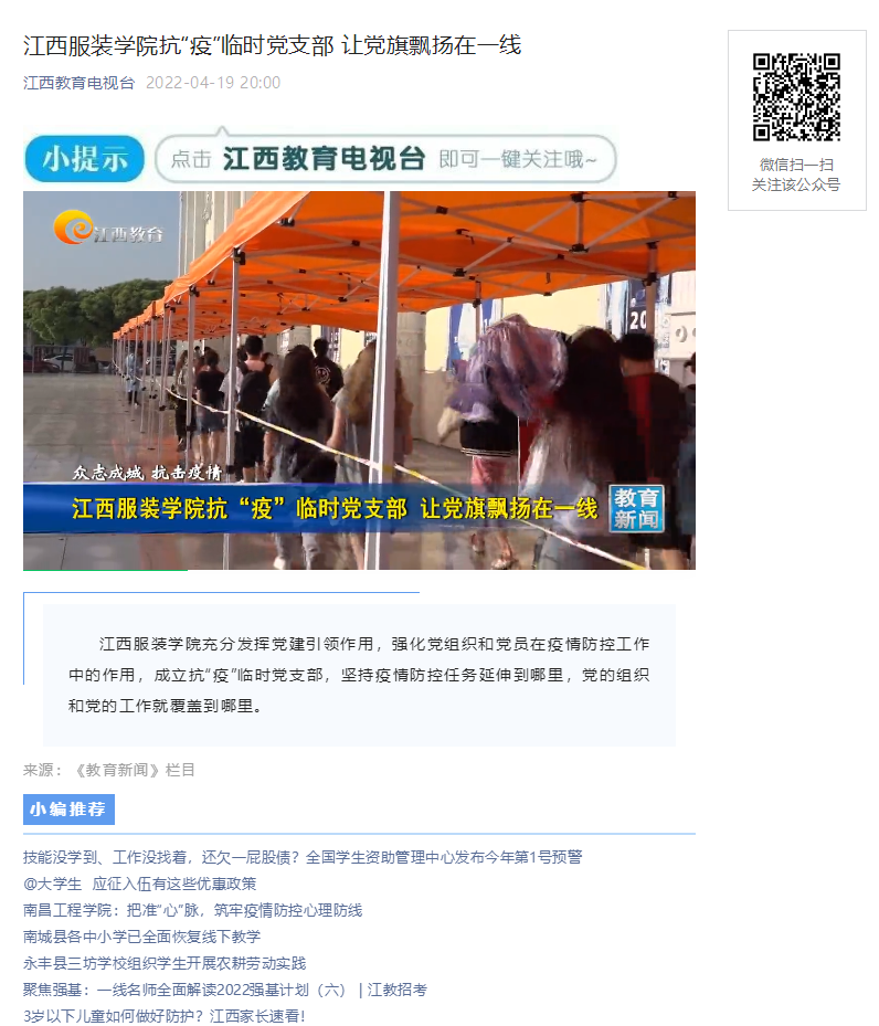 新闻链接:江西教育电视台:江西服装学院抗“疫”临时党支部 让党旗飘扬在一线