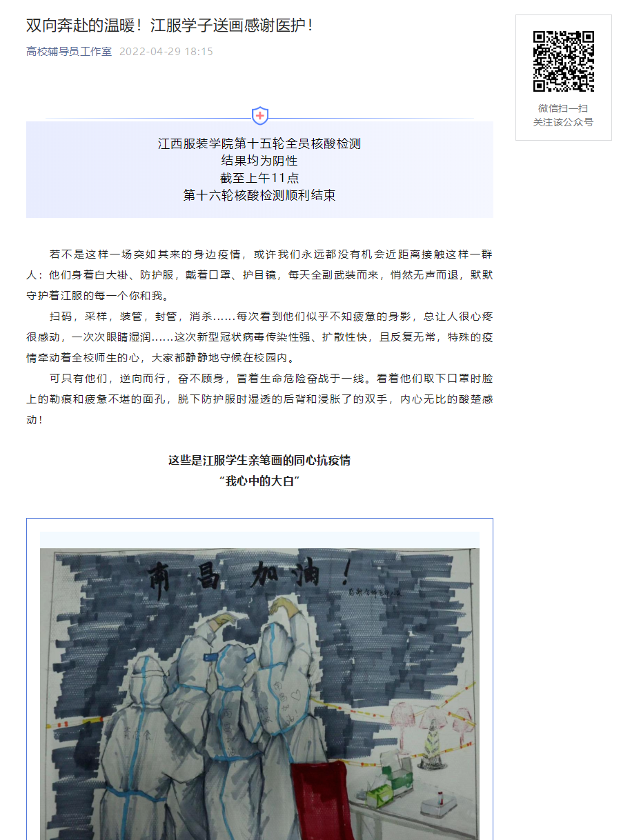 新闻链接:高校辅导员工作室:双向奔赴的温暖!江服学子送画感谢医护!
