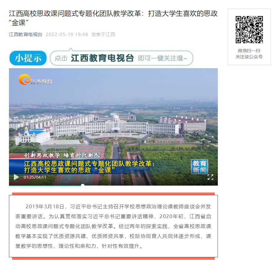 江西教育电视台对我校打造大学生喜欢的思政“金课”进行了报道,以下为新闻链接:
