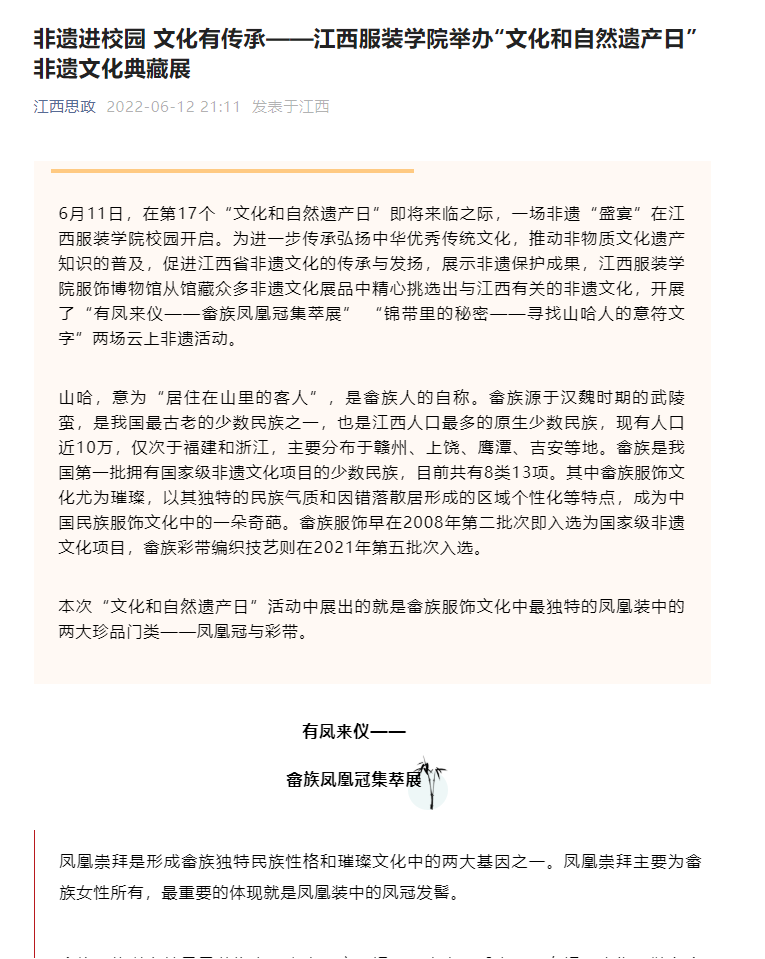 6月11日,在第17个“文化和自然遗产日”即将来临之际,一场非遗“盛宴”在江西服装学院校园开启。为进一步传承弘扬中华优秀传统文化,推动非物质文化遗产知识的普及,促进江西省非遗文化的传承与发扬,展示非遗保护成果,江西服装学院服饰博物馆从馆藏众多非遗文化展品中精心挑选出与江西有关的非遗文化,开展了“有凤来仪——畲族凤凰冠集萃展” “锦带里的秘密——寻找山哈人的意符文字”两场云上非遗活动。