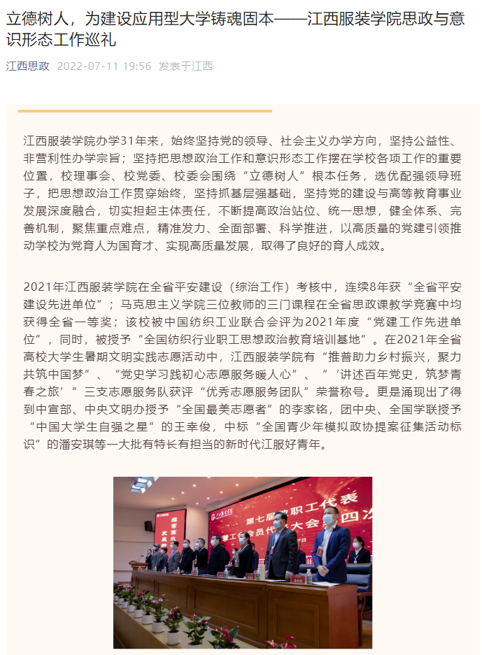 江西服装学院办学31年来,始终坚持党的领导、社会主义办学方向,坚持公益性、非营利性办学宗旨;坚持把思想政治工作和意识形态工作摆在学校各项工作的重要位置,校理事会、校党委、校委会围绕“立德树人”根本任务,选优配强领导班子,把思想政治工作贯穿始终,坚持抓基层强基础,坚持党的建设与高等教育事业发展深度融合,切实担起主体责任,不断提高政治站位、统一思想,健全体系、完善机制,聚焦重点难点,精准发力、全面部署、科学推进,以高质量的党建引领推动学校为党育人为国育才、实现高质量发展,取得了良好的育人成效。