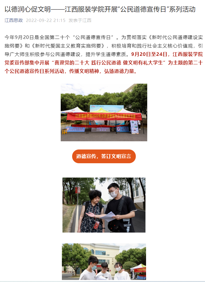 今年9月20日是全国第二十个“公民道德宣传日”。为贯彻落实《新时代公民道德建设实施纲要》和《新时代爱国主义教育实施纲要》,积极培育和践行社会主义核心价值观,引导广大师生积极参与公民道德建设,提升学生道德素质。9月20日至24日,江西服装学院党委宣传部集中开展“喜迎党的二十大 践行公民道德 做文明有礼大学生”为主题的第二十个公民道德宣传日系列活动,传播文明精神,弘扬道德力量。