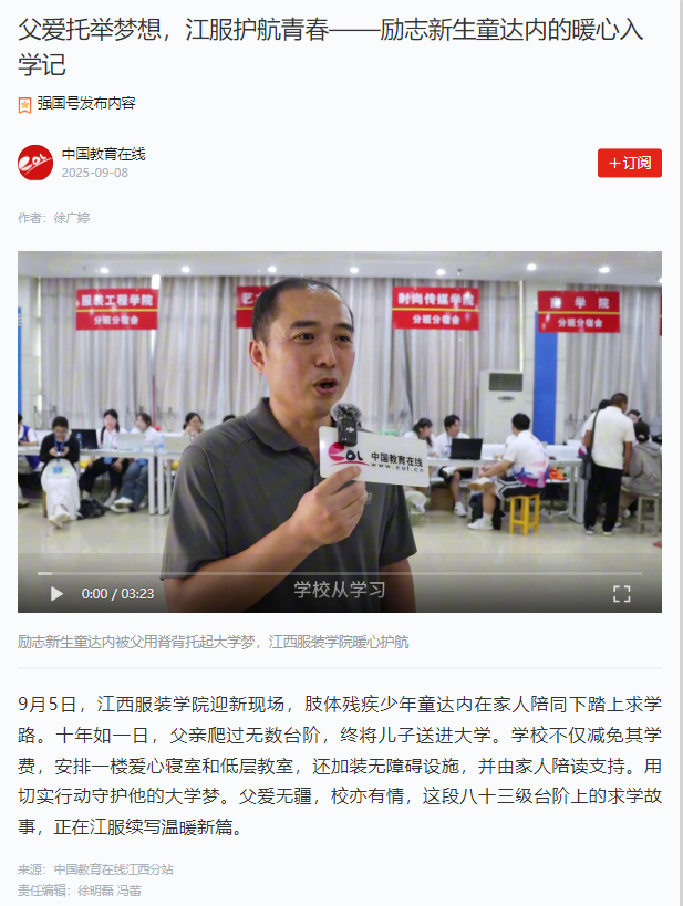 9月5日,江西服装学院迎新现场,肢体残疾少年童达内在家人陪同下踏上求学路。十年如一日,父亲爬过无数台阶,终将儿子送进大学。学校不仅减免其学费,安排一楼爱心寝室和低层教室,还加装无障碍设施,并由家人陪读支持。用切实行动守护他的大学梦。父爱无疆,校亦有情,这段八十三级台阶上的求学故事,正在江服续写温暖新篇。