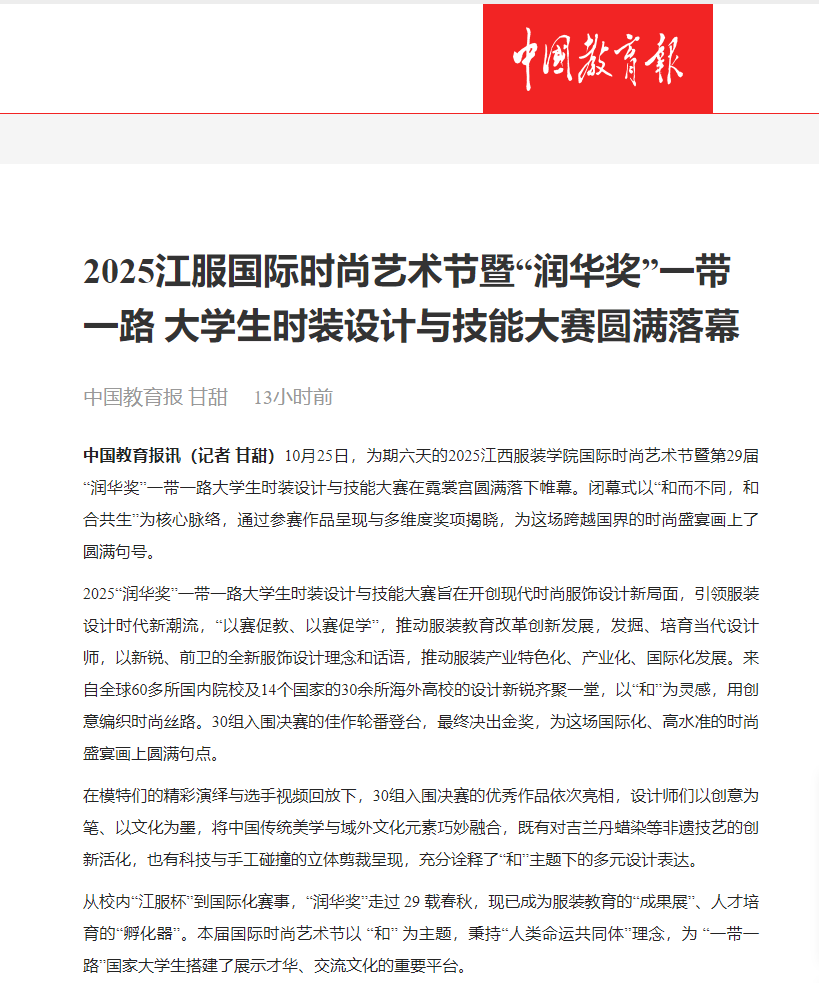 10月25日,为期六天的2025江西服装学院国际时尚艺术节暨第29届“润华奖”一带一路大学生时装设计与技能大赛在霓裳宫圆满落下帷幕。闭幕式以“和而不同,和合共生”为核心脉络,通过参赛作品呈现与多维度奖项揭晓,为这场跨越国界的时尚盛宴画上了圆满句号。