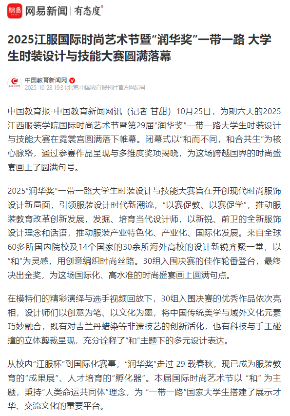 10月25日,为期六天的2025江西服装学院国际时尚艺术节暨第29届“润华奖”一带一路大学生时装设计与技能大赛在霓裳宫圆满落下帷幕。闭幕式以“和而不同,和合共生”为核心脉络,通过参赛作品呈现与多维度奖项揭晓,为这场跨越国界的时尚盛宴画上了圆满句号。
