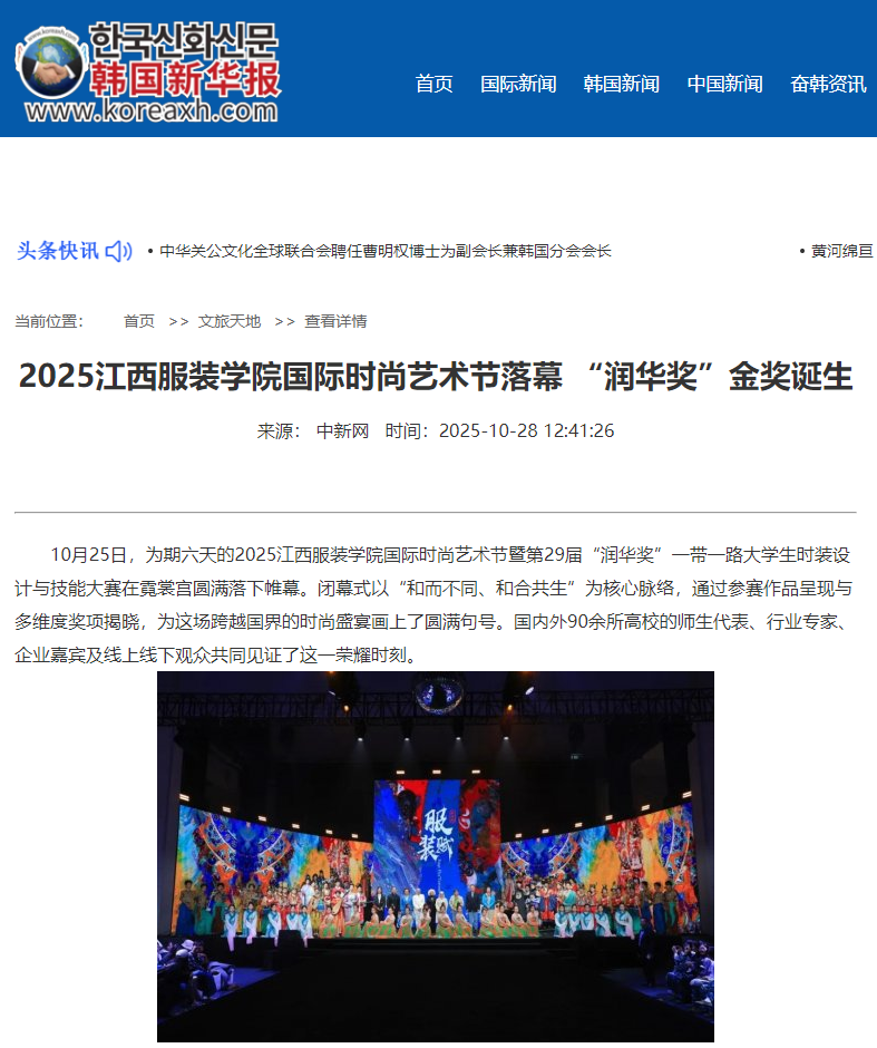 10月25日,为期六天的2025江西服装学院国际时尚艺术节暨第29届“润华奖”一带一路大学生时装设计与技能大赛在霓裳宫圆满落下帷幕。闭幕式以“和而不同、和合共生”为核心脉络,通过参赛作品呈现与多维度奖项揭晓,为这场跨越国界的时尚盛宴画上了圆满句号。国内外90余所高校的师生代表、行业专家、企业嘉宾及线上线下观众共同见证了这一荣耀时刻。