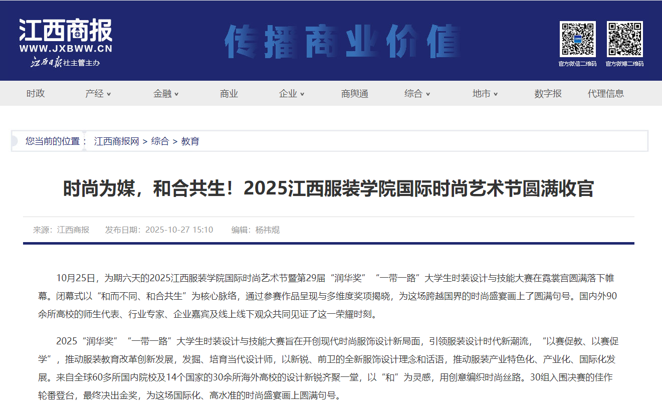 10月25日,为期六天的2025江西服装学院国际时尚艺术节暨第29届“润华奖”“一带一路”大学生时装设计与技能大赛在霓裳宫圆满落下帷幕。闭幕式以“和而不同、和合共生”为核心脉络,通过参赛作品呈现与多维度奖项揭晓,为这场跨越国界的时尚盛宴画上了圆满句号。国内外90余所高校的师生代表、行业专家、企业嘉宾及线上线下观众共同见证了这一荣耀时刻。