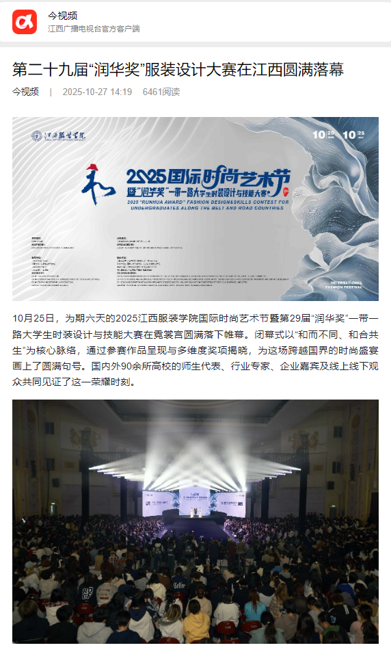 10月25日,为期六天的2025江西服装学院国际时尚艺术节暨第29届“润华奖”一带一路大学生时装设计与技能大赛在霓裳宫圆满落下帷幕。闭幕式以“和而不同、和合共生”为核心脉络,通过参赛作品呈现与多维度奖项揭晓,为这场跨越国界的时尚盛宴画上了圆满句号。国内外90余所高校的师生代表、行业专家、企业嘉宾及线上线下观众共同见证了这一荣耀时刻。