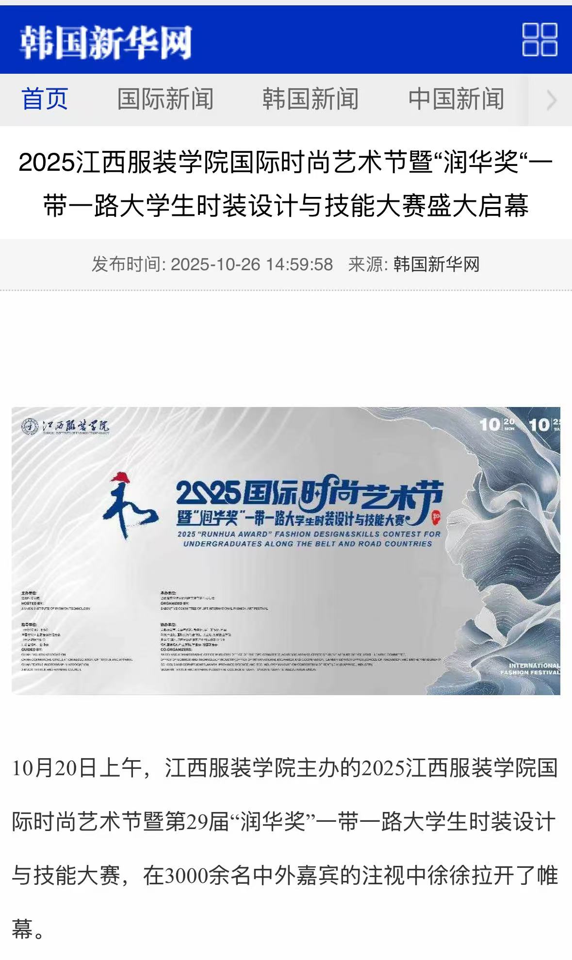 韩国新华网:2025江西服装学院国际时尚艺术节暨“润华奖“一带一路大学生时装设计与技能大赛盛大启幕