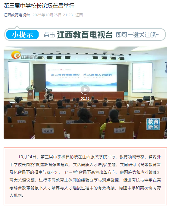 10月24日,第三届中学校长论坛在江西服装学院举行,教育领域专家、省内外中学校长围绕“聚焦教育强国建设,共话高质人才培养”主题,共同研讨《高等教育普及化背景下的招生与就业》、《“三新”背景下高考改革方向、命题趋势和应对策略》两大关键议题,进行不同教育主体间的经验分享与观点碰撞,促进高校与中学在高考综合改革背景下人才培养与人才选拔过程中的有效衔接,构建中学和高校协同育人机制。