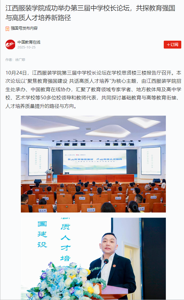 10月24日,江西服装学院第三届中学校长论坛在学校思贤楼三楼报告厅召开。本次论坛以“聚焦教育强国建设 共话高质人才培养”为核心主题,由江西服装学院招生处承办、中国教育在线协办,汇聚了教育领域专家学者、地方教体局及高中学校、艺术学校等50多位校领导和教师代表,共同探讨基础教育与高等教育衔接、人才培养质量提升的路径与方向。