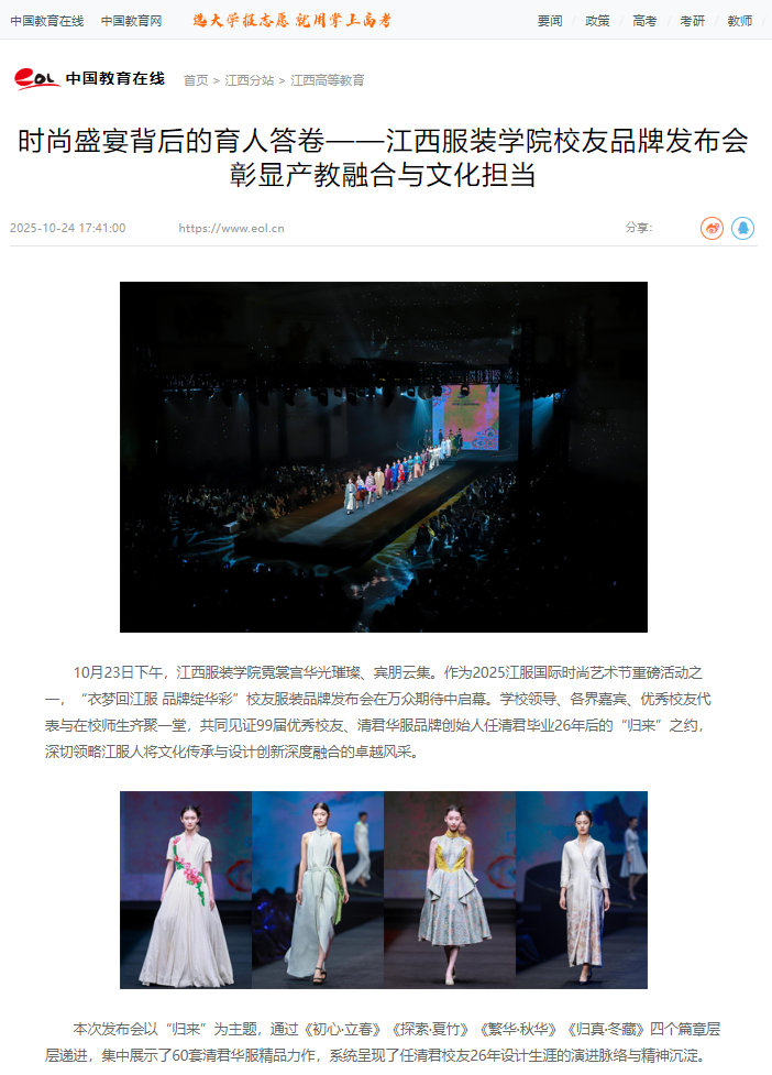 10月23日下午,江西服装学院霓裳宫华光璀璨、宾朋云集。作为2025江服国际时尚艺术节重磅活动之一,“衣梦回江服 品牌绽华彩”校友服装品牌发布会在万众期待中启幕。学校领导、各界嘉宾、优秀校友代表与在校师生齐聚一堂,共同见证99届优秀校友、清君华服品牌创始人任清君毕业26年后的“归来”之约,深切领略江服人将文化传承与设计创新深度融合的卓越风采。