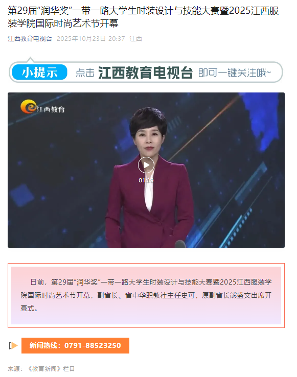 江西教育电视台:第29届“润华奖”一带一路大学生时装设计与技能大赛暨2025江西服装学院国际时尚艺术节开幕