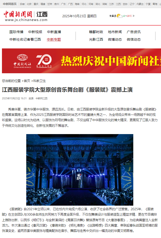 秀美华夏,锦衣华裳中华服饰,源远流长。日前,由江西服装学院全新升级的大型原创音乐舞台剧《服装赋》在霓裳宫震撼上演,作为2025江西服装学院国际时尚艺术节的重磅大秀之一,为全场观众带来一场跨越千年的视听盛宴。这场以时光为经纬、以服饰为符号的舞台剧,不仅诠释了中华服饰文化的博大精深,更展现了江服人致力于传统文化创造性转化、创新性发展的不懈追求。