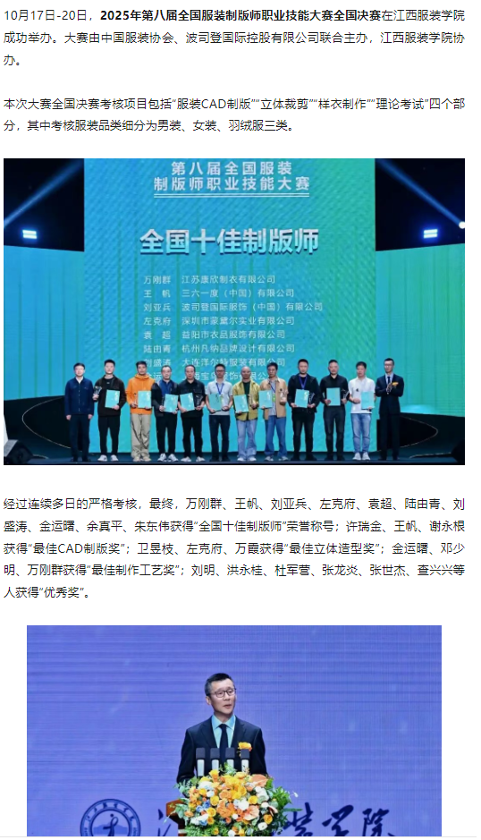 10月17日-20日,2025年第八届全国服装制版师职业技能大赛全国决赛在江西服装学院成功举办。大赛由中国服装协会、波司登国际控股有限公司联合主办,江西服装学院协办。
